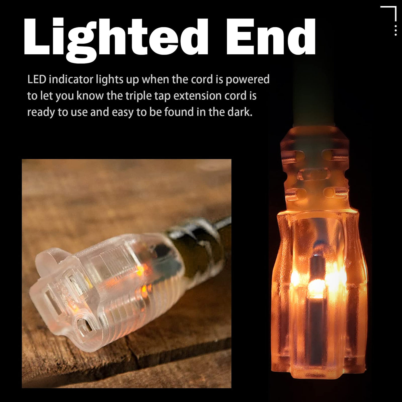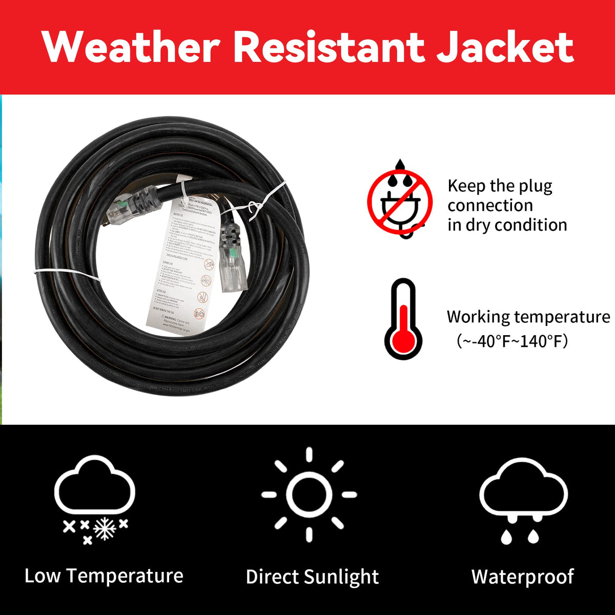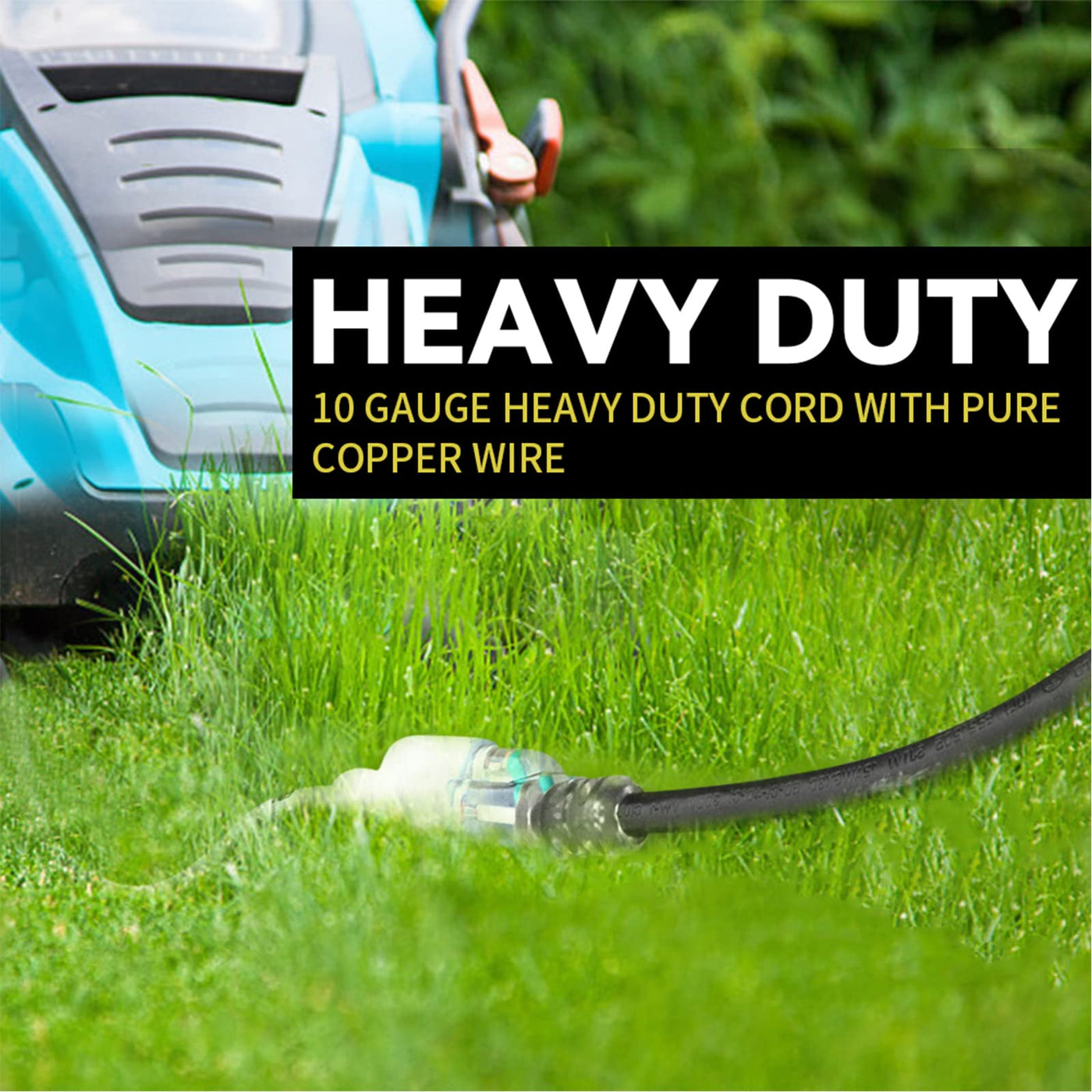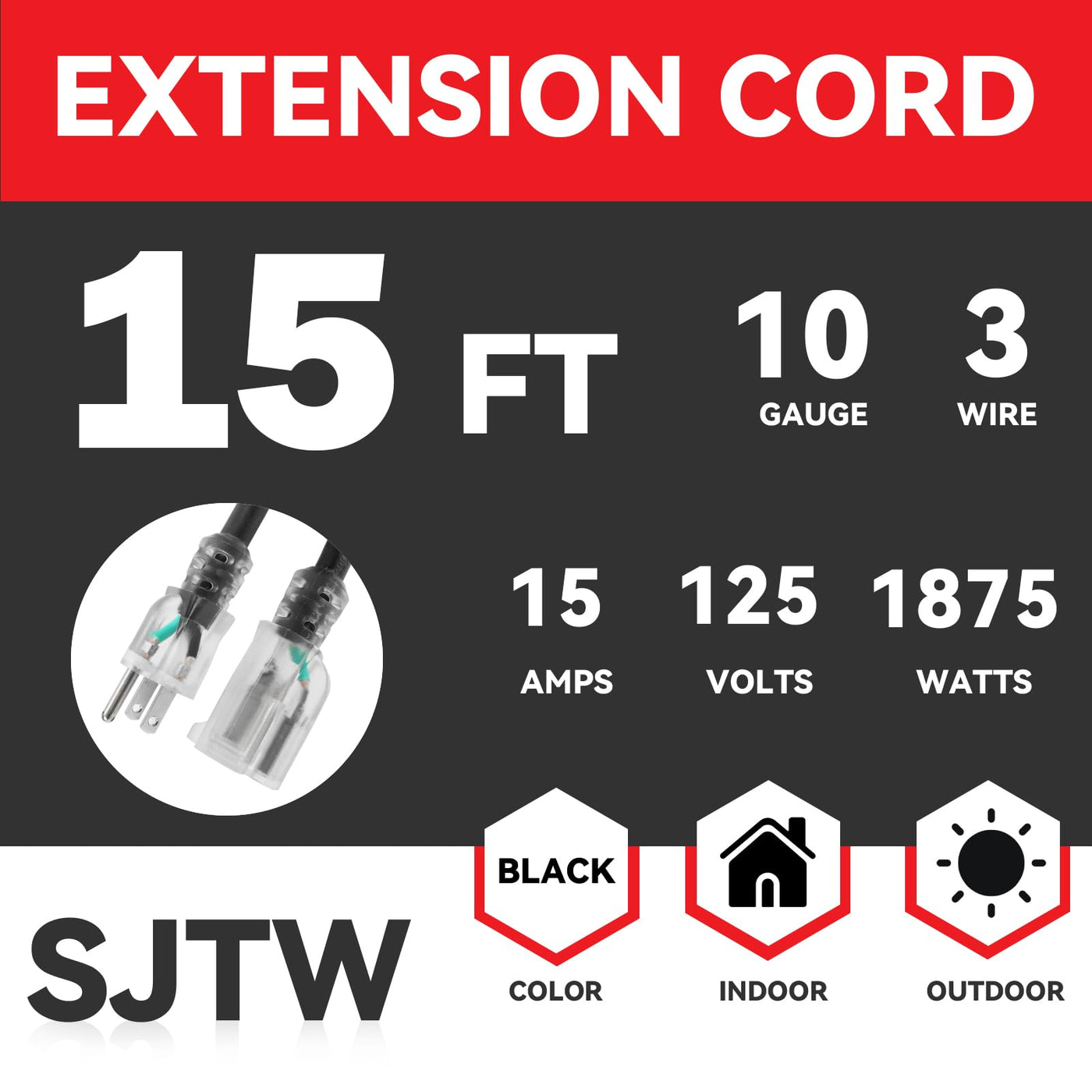 Ep 15 Ft Lighted Outdoor Extension Cord 10/3 Sjtw Heavy Duty Black Extension Cable With 3 Prong Grounded Plug For Safety, Ul L