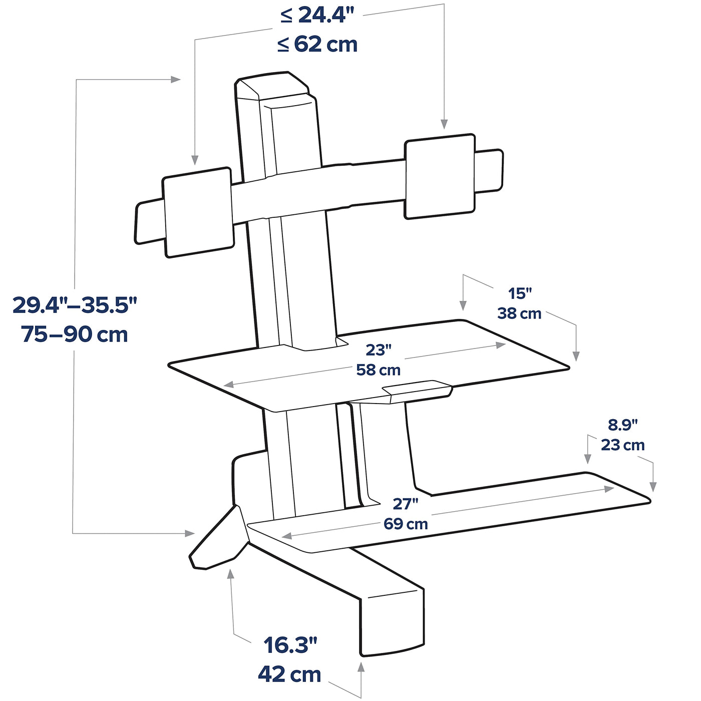 Broad compatibility: Fits two screens up to 24 inches diagonal and 6 to 12 pounds each; compatible with VESA patterns 75x75mm and 100x100mm | Room to work: 15 x 23-inch worksurface holds all your desktop essentials; large 27 x 9-inch keyboard tray easily accommodates a standard keyboard and mouse; keyboard tray offers back-tilt functionality, moves in tandem with worksurface and is positioned 6 inches below it, promoting comfort and ergonomics | Ergonomic workspace: Fine-tune your sitting or standing position with 18 inches of worksurface lift plus 5 inches of independent screen height adjustment; adjusts smoothly from minimum monitor height of 8.7 inches to maximum monitor height of 31.5 inches; install screens at a 3 or 8-degree upward angle for optimal viewing | Easy setup: Includes height-adjustment column, desk clamp, crossbar, two monitor pivots, worksurface and large keyboard tray; desk clamp attaches to desktops 0.47 to 2.4 inches thick; variable weight setting enables effortless movement; individually adjust monitors and keyboard tray for personalized comfort | Built to last: Extensive quality testing ensures your workstation holds up to rigorous daily use; Ergotron products set the standard for quality with a 5-year warranty and expert technical support