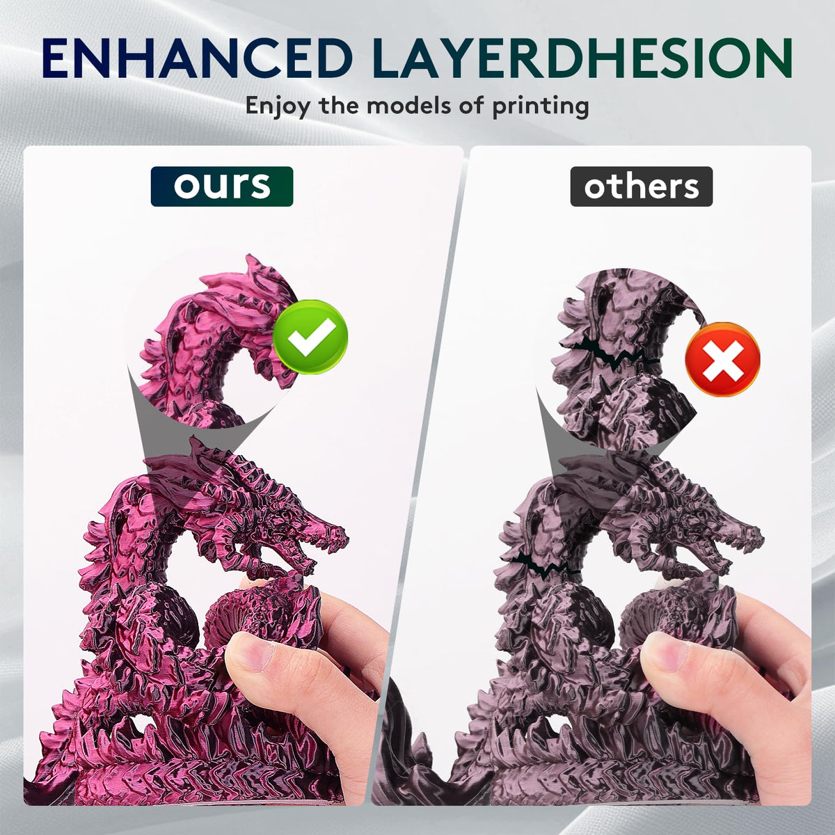 Q: What is the diameter and tolerance of the ERYONE Silk Dual Color PLA Filament?A: The ERYONE Silk Dual Color PLA Filament has a diameter of 1.75mm with a tolerance of ± 0.03mm, ensuring high accuracy and consistent feeding during the printing process.