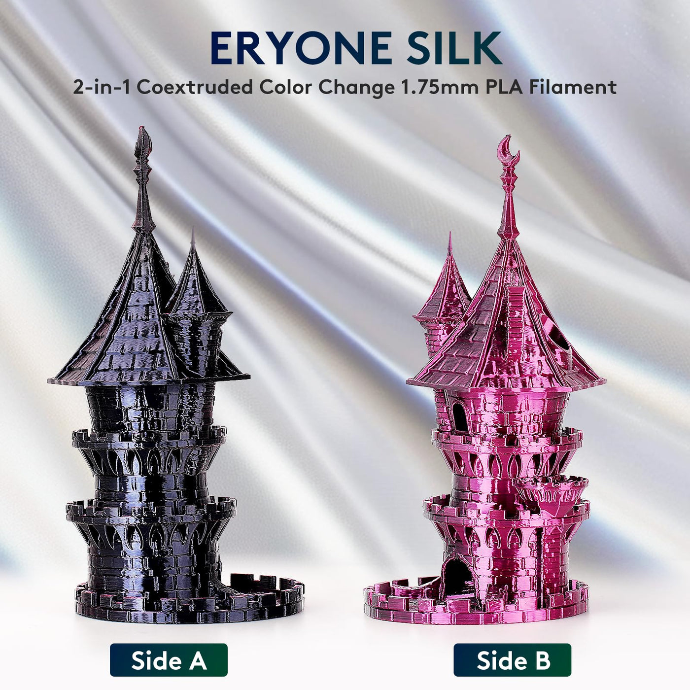Q: How does the dual-color feature of this filament work?A: The dual-color feature of the ERYONE Silk Dual Color PLA Filament allows you to change the visible color by rotating the color-blending filament to different orientations, enabling unique and creative printing results.