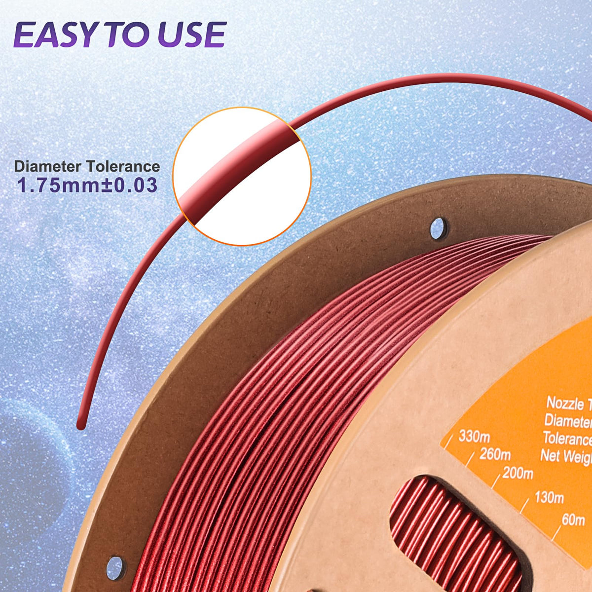 Q: What are the characteristics of this glitter PLA filament?A: This glitter PLA filament features a shiny, sparkly finish that enhances the aesthetic appeal of 3D printed objects. It is made from PLA material, which is biodegradable and easy to print with.