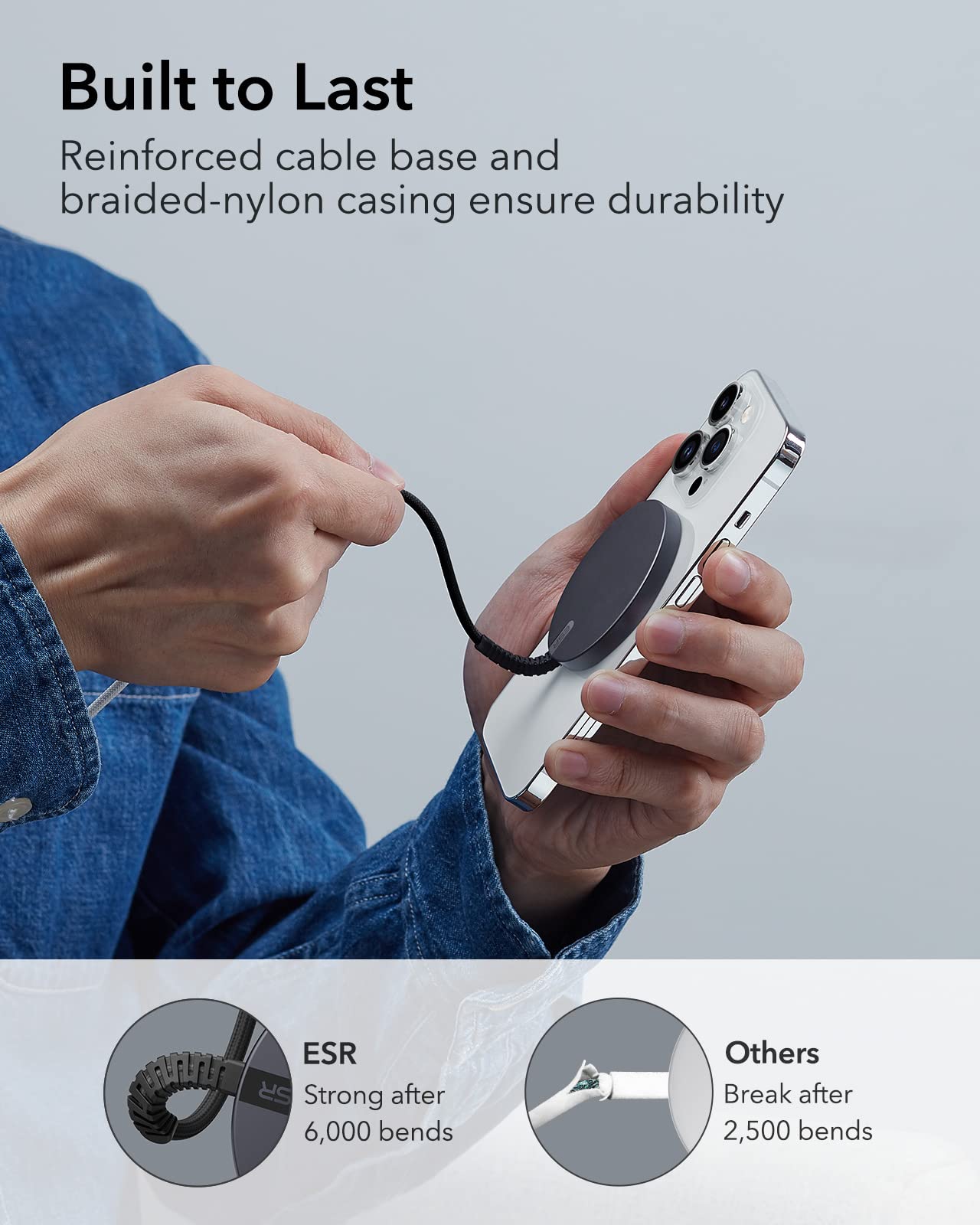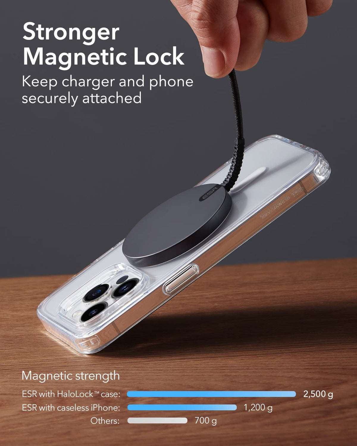 Q: What is the length of the charging cable included?A: The ESR HaloLock Mini Wireless Charger comes with an extra-long 5-foot cable, allowing you to charge comfortably while using your device.