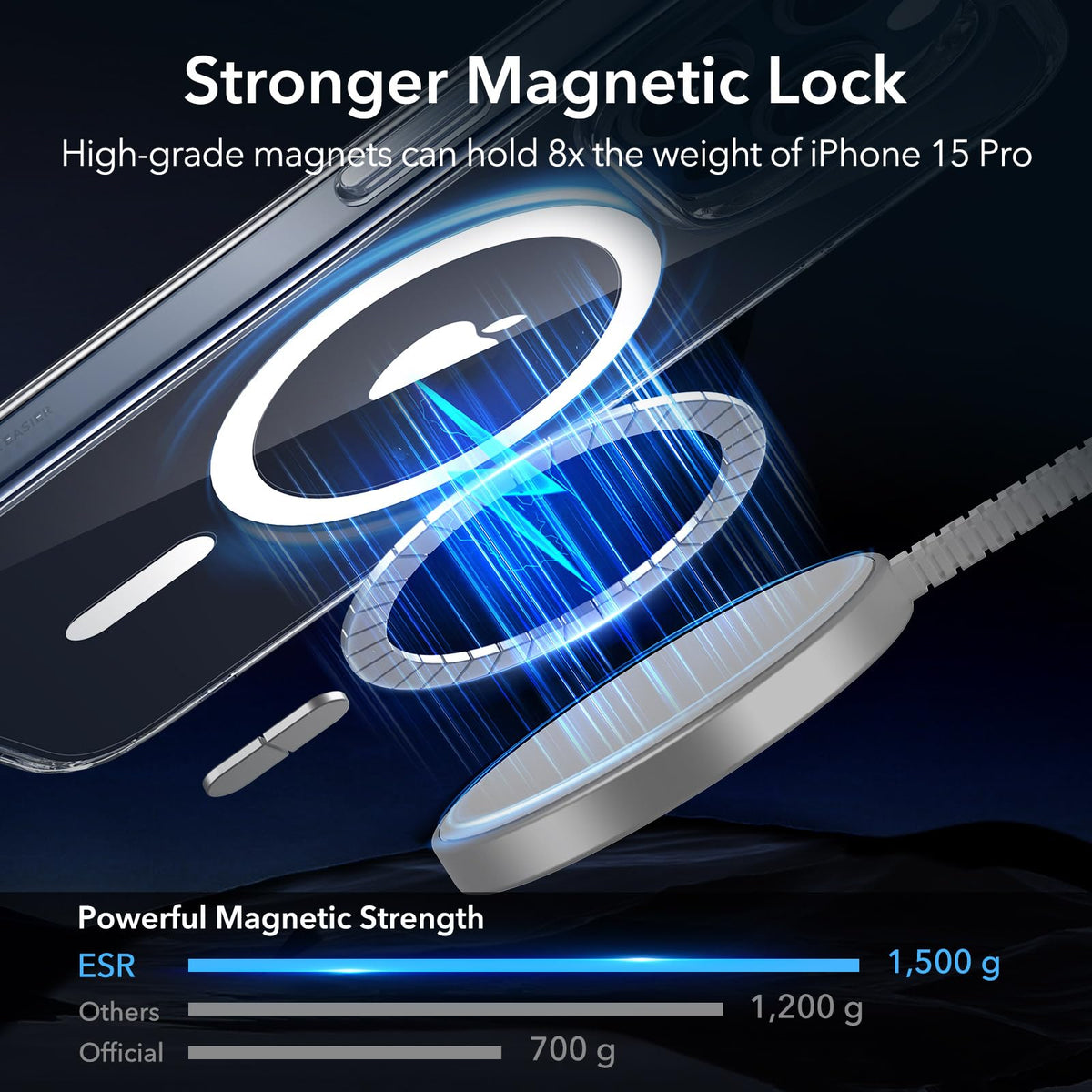 Q: Can I use MagSafe accessories with this case?A: Yes, the ESR case features a stronger magnetic lock with built-in magnets that provide a holding force of 1,500 g, ensuring compatibility with all MagSafe accessories for faster and easier wireless charging.