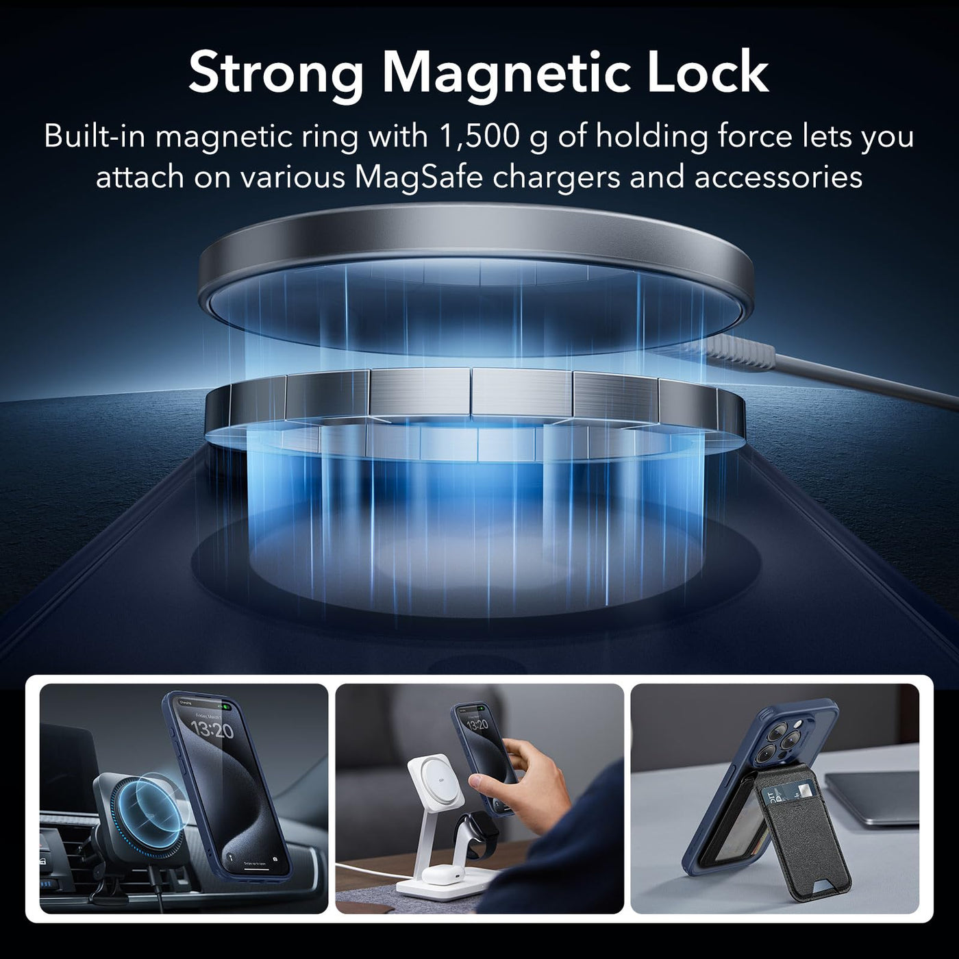 Q: Is the ESR for iPhone 15 Pro Case compatible with MagSafe accessories?A: Yes, the ESR for iPhone 15 Pro Case features a stronger magnetic lock with built-in magnets that provide a holding force of 1,500 g, making it fully compatible with all MagSafe accessories for faster and easier wireless charging.