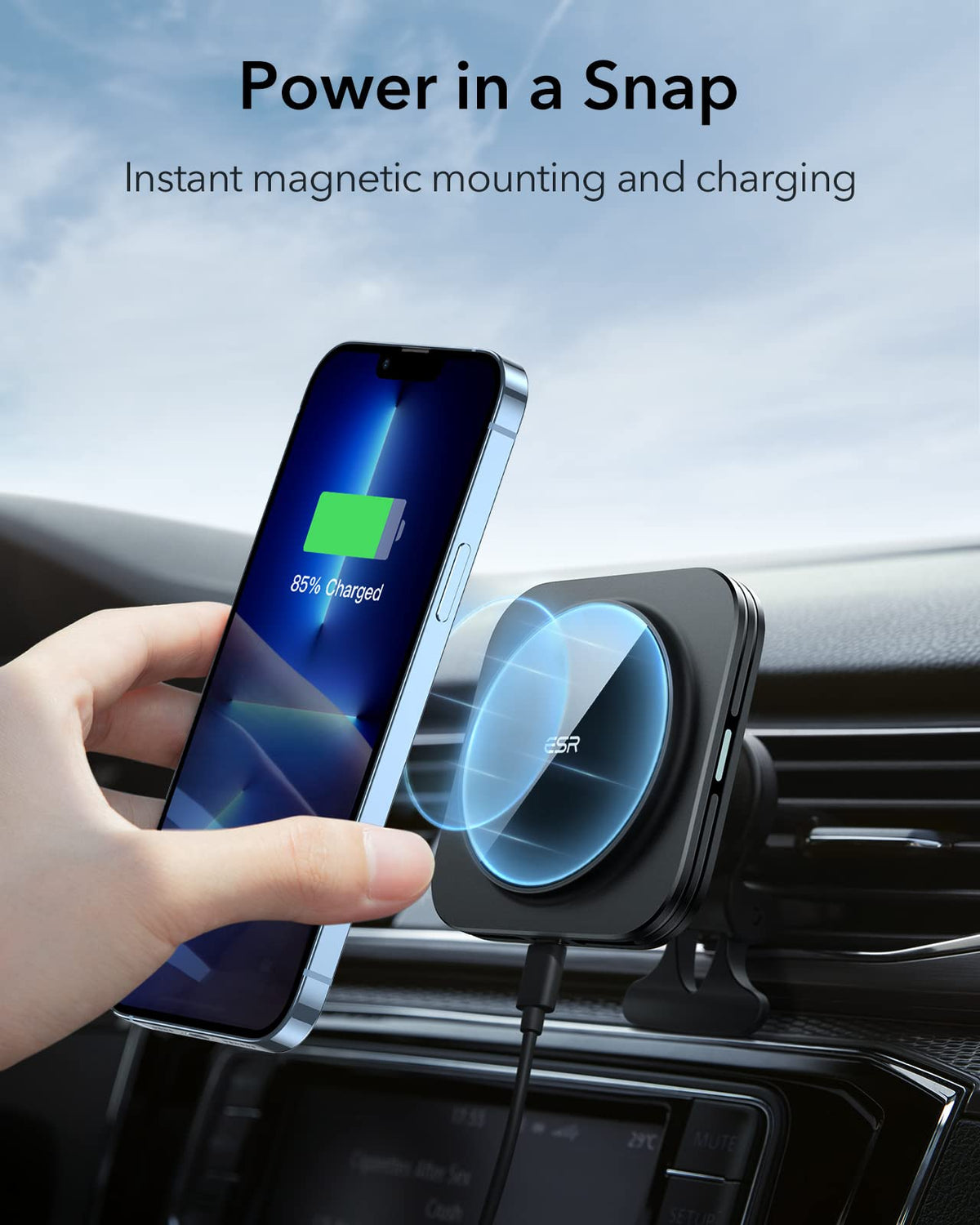 Fast Charging: Intelligent Heat Management And 36W Car Adapter Enable Speeds Nearly Identical To Official Magsafe Chargers; Only Compatible With Iphone 16/15/14/13/12 Series Phones | Secure Magnetic Lock: Powerful Magnets With 1,400 G Of Holding Force And A Non-Slip Silicone Ring Keep Your Phone Securely In Place, Even When Driving On Bumpy Roads; An Official Magsafe Case Or Esr Halolock Case Is Recommended For Rough Terrain | Ready For Navigation: Single-Handedly Switch Between Portrait And Landscape For Easy Navigation | Stable Vent Mount: Strong Vent Clip And Support Arm Provide Enhanced Mounting Stability | Everything You Need To Fast Charge: Halolock Magnetic Wireless Car Charger, 36W Qc 3.0 Dual Port Usb-A Car Adapter, Air Vent Clip, 3.3 Ft (1 M) Usb-A To Usb-C Cable, And Manual | Complete Customer Support: Detailed Setup Videos And Faqs, Comprehensive 12-Month Protection Plan, Lifetime Support, And Personalized Help