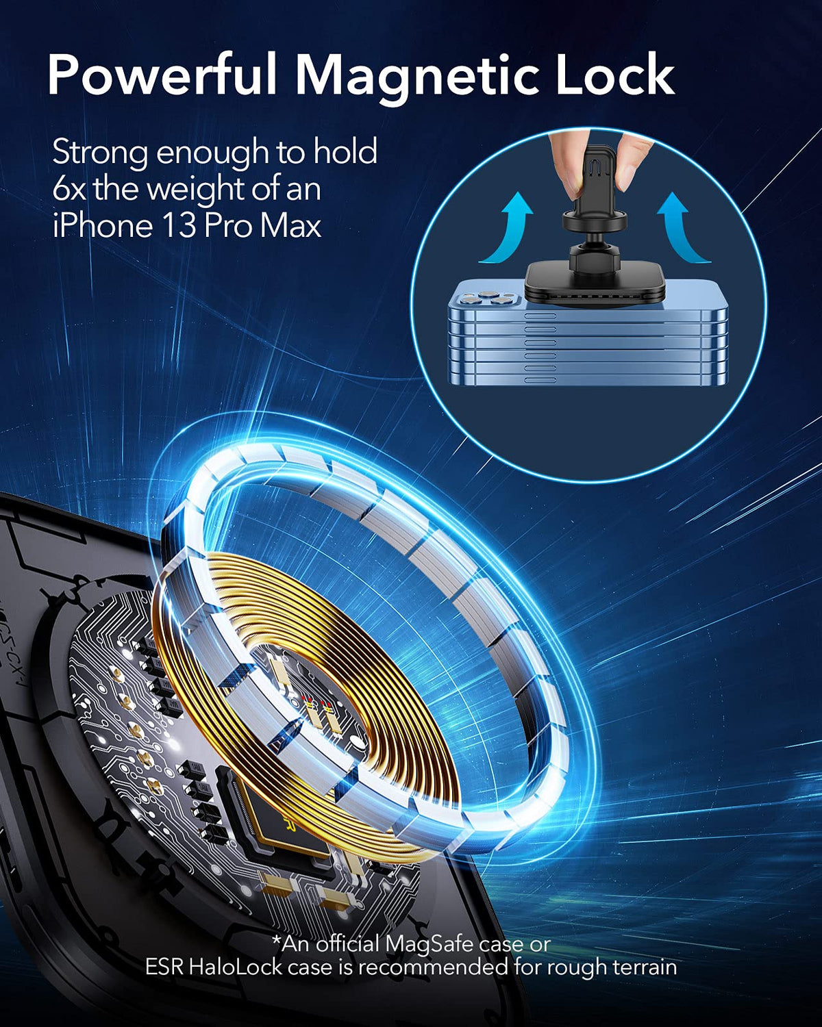 Q: How stable is the mount during driving on bumpy roads?A: The mount features a powerful magnetic lock with 1,400 g of holding force and a non-slip silicone ring, ensuring that your phone remains securely in place even on bumpy roads. It is recommended to use an official MagSafe case or ESR HaloLock case for optimal stability.