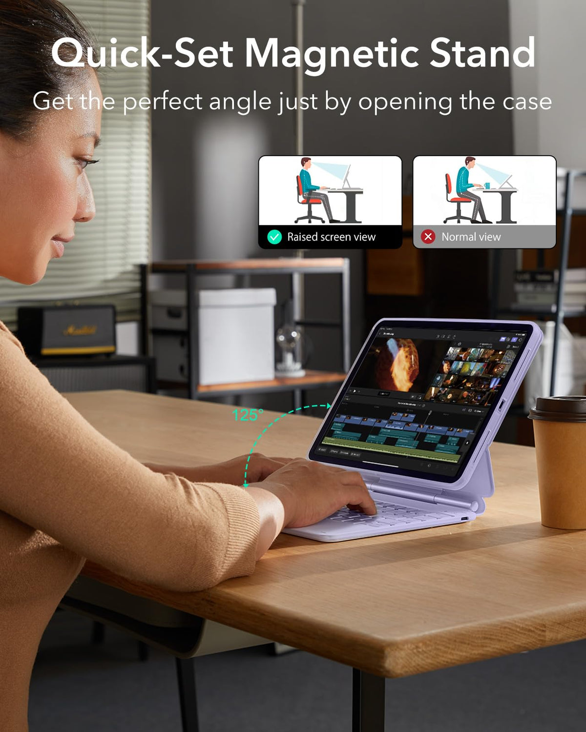 Q: How does the Quick-Set Magnetic Stand work?A: The Quick-Set Magnetic Stand features ultra-strong magnets that securely attach the case to your iPad, allowing you to open the floating cantilever stand to your preferred angle for typing or browsing. This design provides flexibility and convenience for various tasks.