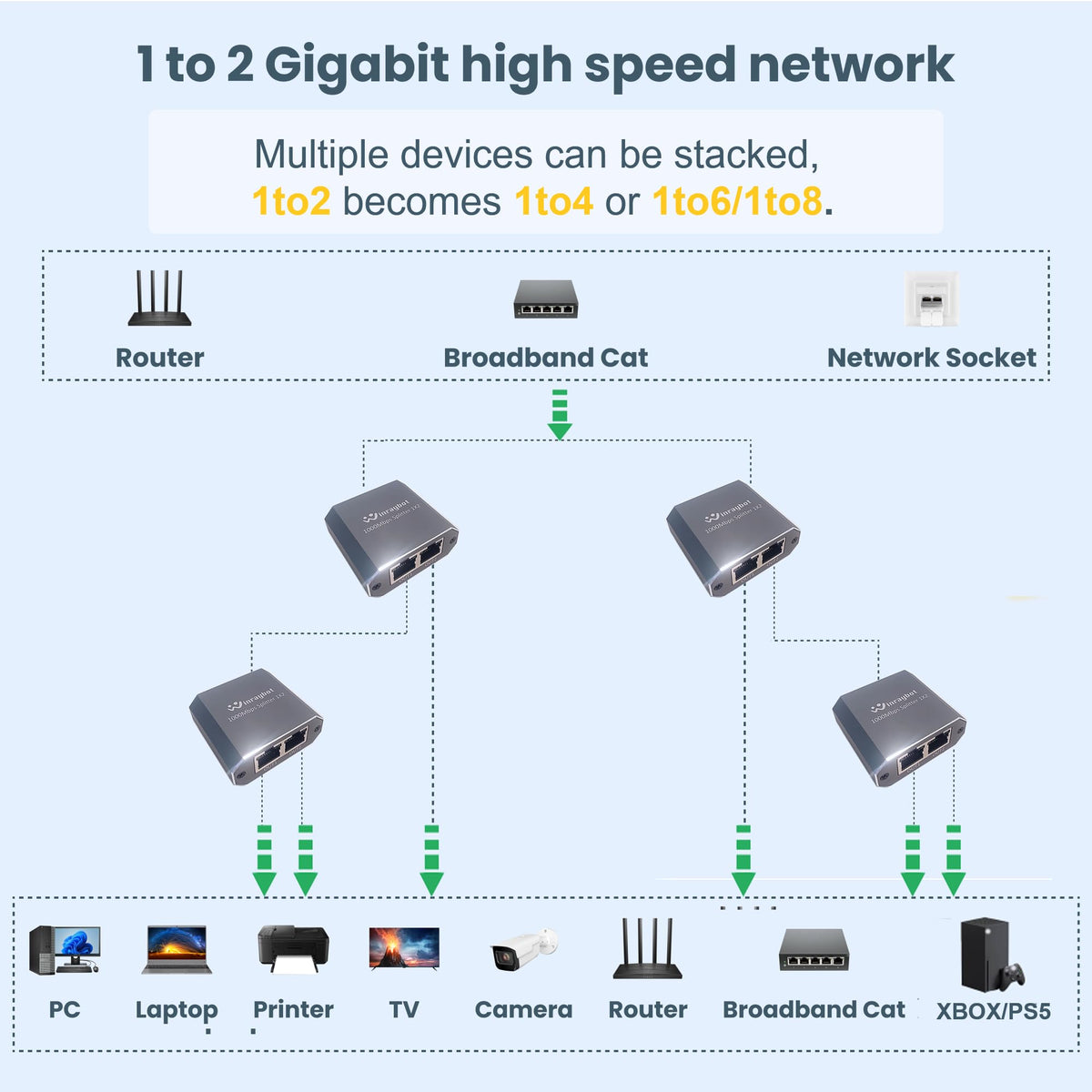 Ethernet Splitter,Ethernet Splitter 1 To 2,Ethernet Switch 2 Port 1000Mbps,Lan Splitter,Ethernet Cable Splitter, Lan Rj45 Port W