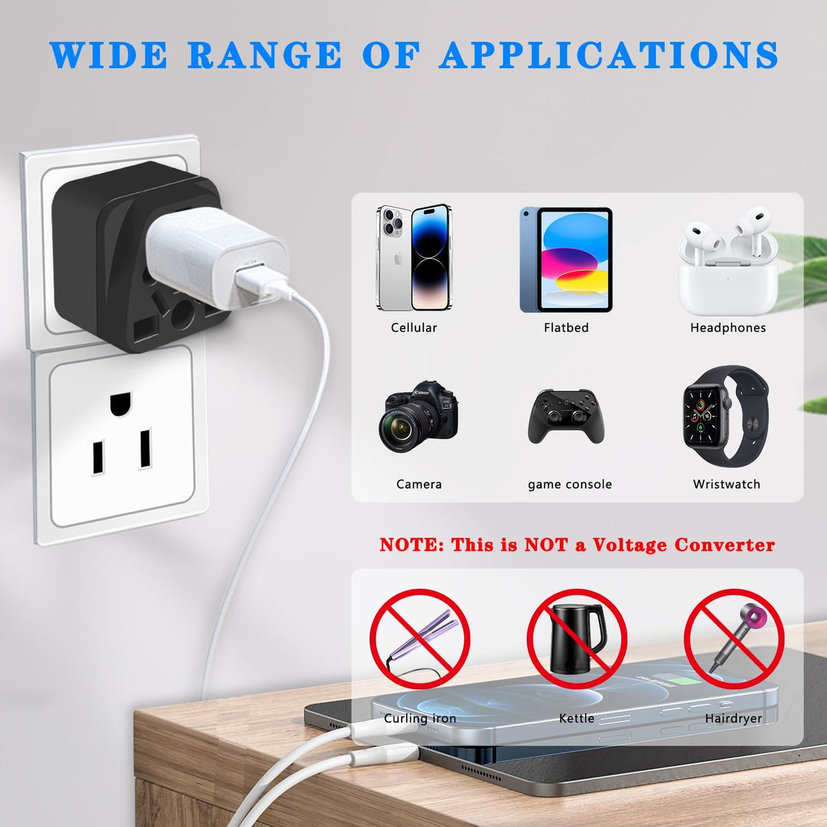 Q: Is this adapter suitable for charging high wattage devices?A: Yes, the US travel plug adapter has a maximum capacity of 2000 watts (maximum 250V, 10 amperes), allowing you to safely charge devices like mobile phones, notebooks, and cameras.