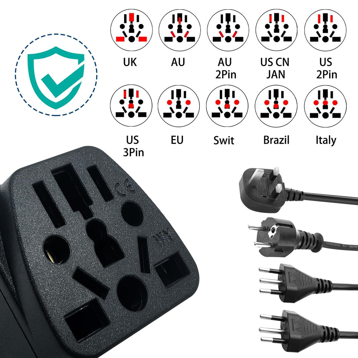 Q: What types of plugs does this European to US plug adapter support?A: This European to US plug adapter supports a variety of plug types including American A/B type, European C&E/F type, Australian I type, British G type, Italian L type, and Swiss and Israeli plugs, making it versatile for international travelers.