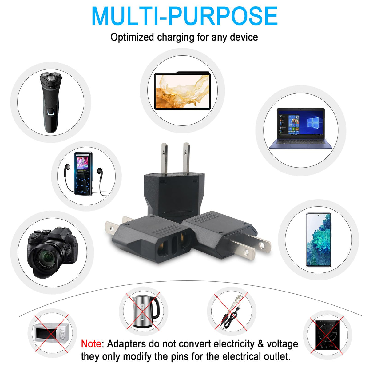Q: Is this European to US Travel Plug Adapter suitable for all devices?A: This adapter is designed for devices that operate within the 110V to 250V voltage range. It is perfect for charging smartphones, tablets, laptops, and other small electronics. However, it does not convert voltage, so ensure your device is compatible with the voltage specifications.