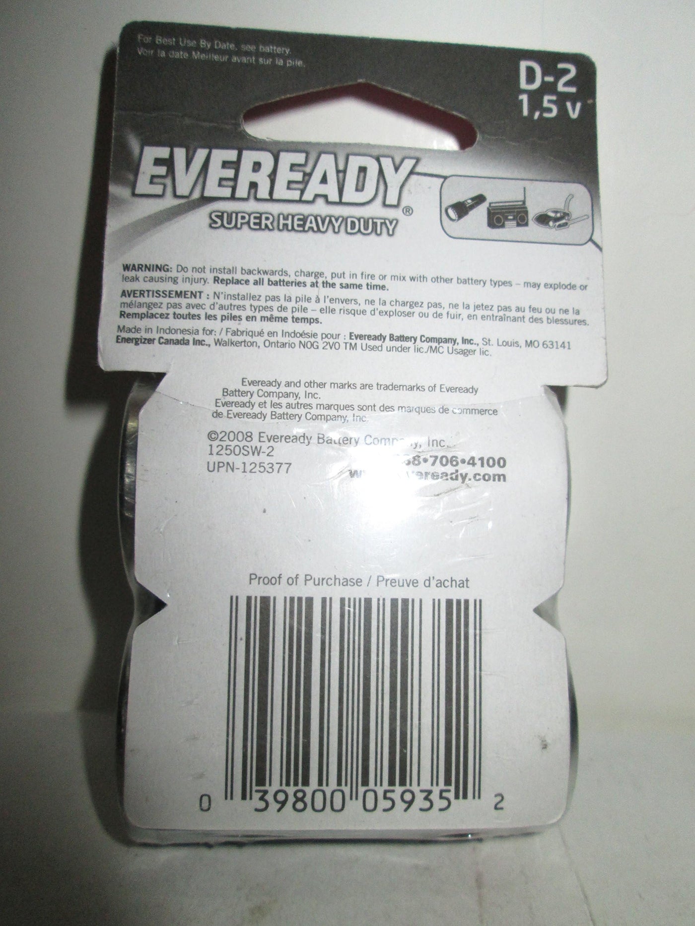 Q: What is the country of origin for Eveready Super Heavy Duty D Batteries?A: The Eveready Super Heavy Duty D Batteries are produced in the United States, ensuring high-quality manufacturing standards.