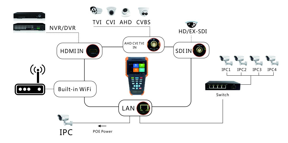Overall: The 4 Inch Ips Touch Screen Ip Camera Tester Is Designed For Maintenance And Installation Of Ip Analog, Hd Coaxial Cameras As Well As Other Security Equipment. The 800*480 Resolution Enables It To Display Network Hd Cameras And Analog Cameras In High Resolution. The Unit Supports Many Ip Ptz And Analog Ptz Control. The All In One Camera Tester Can Make A Safer Working Conditions And Increase Productivity. Features: *4 Inch Touch Screen, 800*480 Resolutions *H.265 & H .264 Ip, 4K Video Display Via Mainstream Auto Log In And Display Image, Create Testing Report *Support Axis, Hikvision Camera Test, Enter App, Input Username And Password To Test *8Mp Tvi/4Mp Cvi/5Mp Ahd *Cvbs Camera Test And Ptz Control *Ipc Test, Hik Test Tool (Support Hikvision Camera Testing), Dh Test Tool (Support Dahua Camera Testing) *Ip Discovery, Just By One Key To Detect All Network Cameras Ip Address And Auto Display *Dc12V 3A Power Output *Poe Dc48V Power Output, Max Power 24W *Innovative Coaxial Hd Focus, Video Signal Quality Test *10/100/1000M Ethernet, Network State And Traffic Display *Wrist Design, Portable And Easier To Carry *Network Tool: Ping Test, Ip Address Scan, Port Flashing Etc *Drop-Down Menu, Can Select Poe Power, Ip Setting, Cvbs, Lan Info Etc *Self -Update Software, You Can Install Apps With Android Version *Media Player, 4K Video Files And Mkv/Mp4 Media Files Play *Ptz Control Supports More Than 30 Protocols Such As Pelco-P, Pelco-D, And Samsung *Audio In, Support Record And Save The Audio/Led Lamp, Calculators, Music Players And Other Application Tools *7.4 V /2400Mah Lithium Ion Polymer Battery, After 4~5 Hours Charging, Working Time Lasts About 8 Hours Packing List: 1) Tester 3). Adaptor Dc12V/1A 4) 1Pcs Battery 5). Tool Bag / Dc12V Power Cable/Bnc Cable/ Rs485 Cable/ Audio Cable