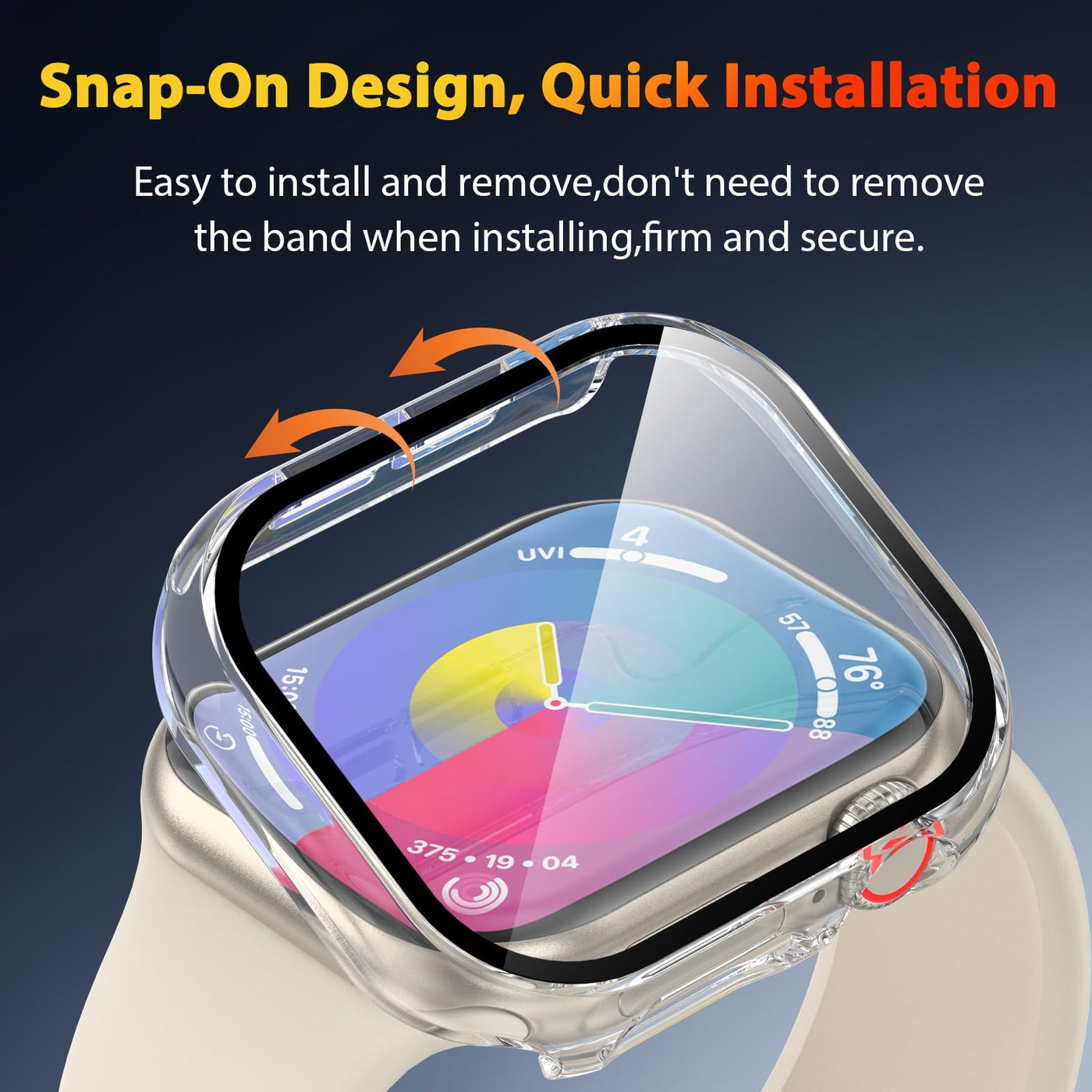 Q: How does the tempered glass screen protector enhance protection?A: The tempered glass screen protector features a 9H hardness rating, which makes it highly scratch-resistant and capable of withstanding daily wear and tear. It effectively resists scratches, bumps, and impacts, providing comprehensive protection for your Apple Watch screen.