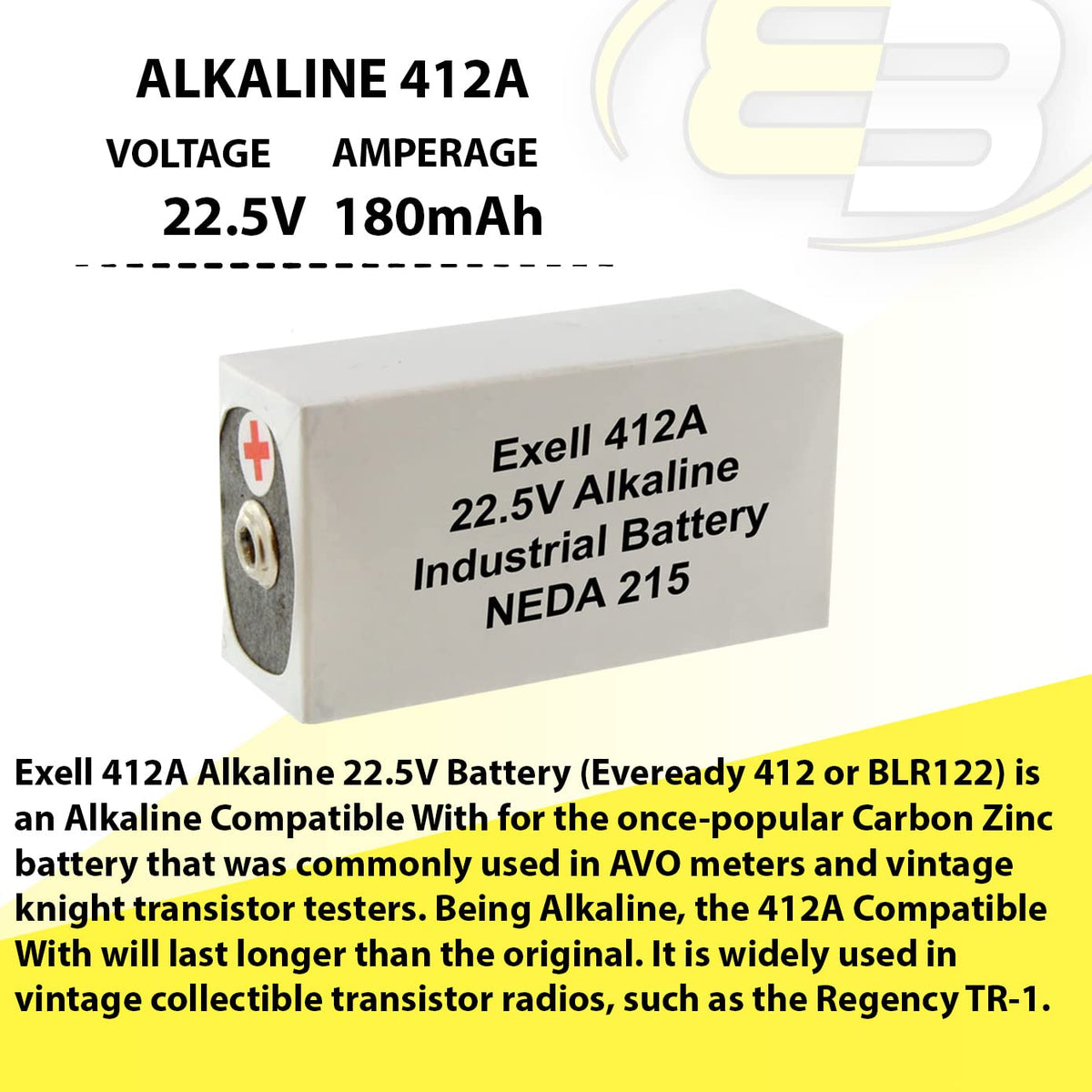 Exell 412A Alkaline 22.5V Battery Neda 215 Replaces 15F20,Blr122,V72Pxexell 412A Alkaline 22.5V Battery (Eveready 412 Or Blr122) Is An Alkaline Replacement For The Once-Popular Carbon Zinc Battery That Was Commonly Used In Avo Meters And Vintage Knight Transistor Testers. Being Alkaline, The 412A Replacement Will Last Longer Than The Original. It Is Widely Used In Vintage Collectible Transistor Radios, Such As The Regency Tr-1.Specifications Voltage: 22.5V Amperage: 180Mah Chemistry: Alkaline Length: 1.03In (26.2Mm) Height: 2.00In (50.8Mm) Width: 0.63In (15.9Mm) Terminals: Socket Contacts Exell 412A Alkaline Battery Replaces 15F20, 215, 412, 412A, A412, B122, Ba 261/U, Blr-122, Blr122, M122, M215, M2152, Mn122, Px72, U15, Ug015, V72Px, Vs084Exell 412A Alkaline Battery Applications Simpson 269Af Multimeter, Simpson 269, Ray-0-Vac 516, Regency Tr-1 Transistor, And Other Vintage Devices. Exell Batteries Not Only Provide Consumers With High Efficiency, Long-Lasting Performance, They Also Function As Replacement Batteries For An Array Of Common And Unique Applications. Ranging From Vintage Camera Equipment To Sophisticated Medical Testing Equipment, Exell Batteries Can Meet The Needs Of All Consumers. Exell Battery Is One Of The Few Product Lines Proudly Assembled In The Usa. Made With Alkaline Cells, Exell Batteries Will Last Longer And Offer Consumers Excellent Reliability. Specifications Output Voltage: 22.5V Amperage: 180Mah Color: White Chemistry: Alkaline Length: 26.2Mm Height: 50.8Mm Width: 15.9Mm Country Of Manufacture: U.S.A.Compatibilityray-0-Vac: 516 Regency: 15F20, 412, B122, Blr122, Eveready, Tr-1 Transistor Simpson: 269, 269Af Multimeter
