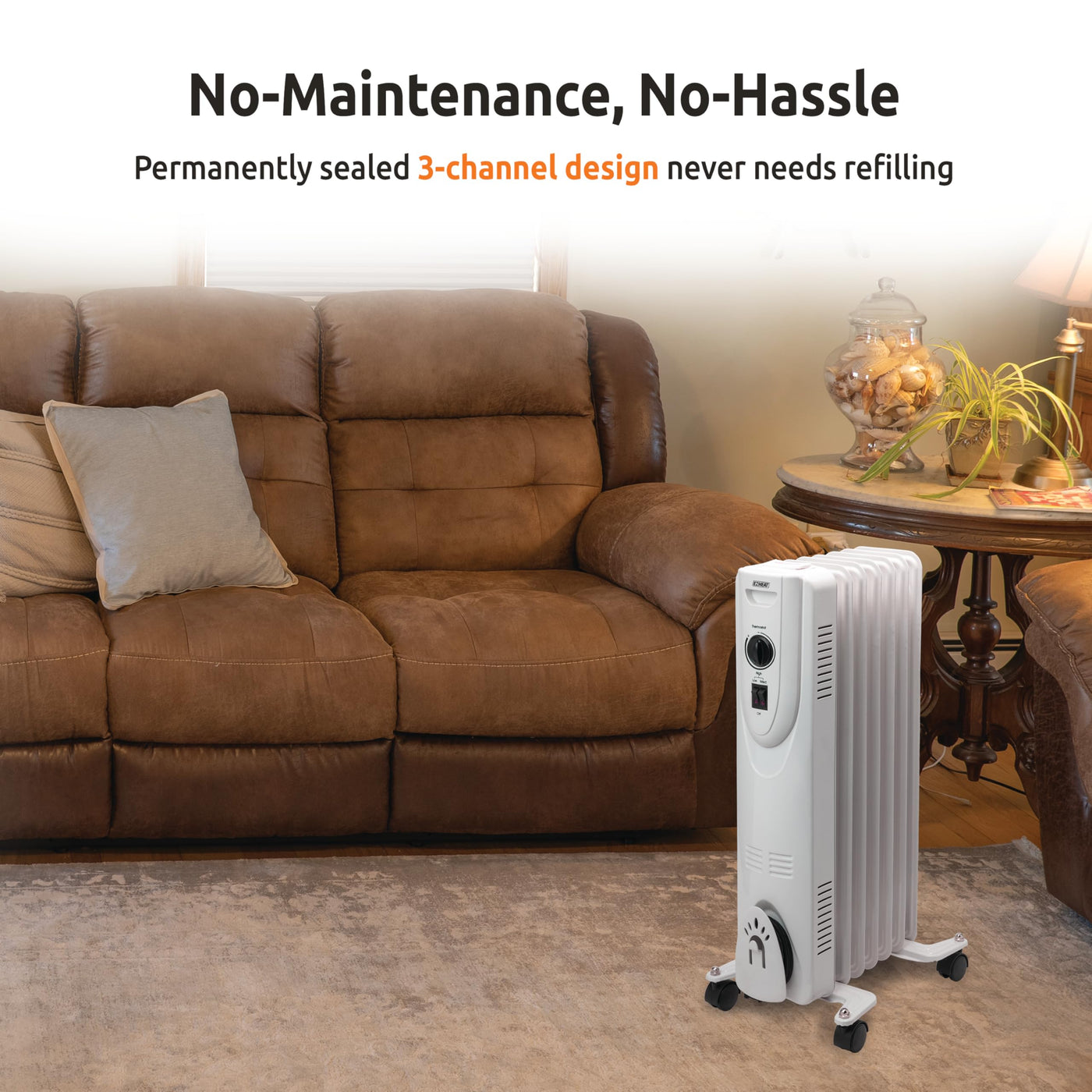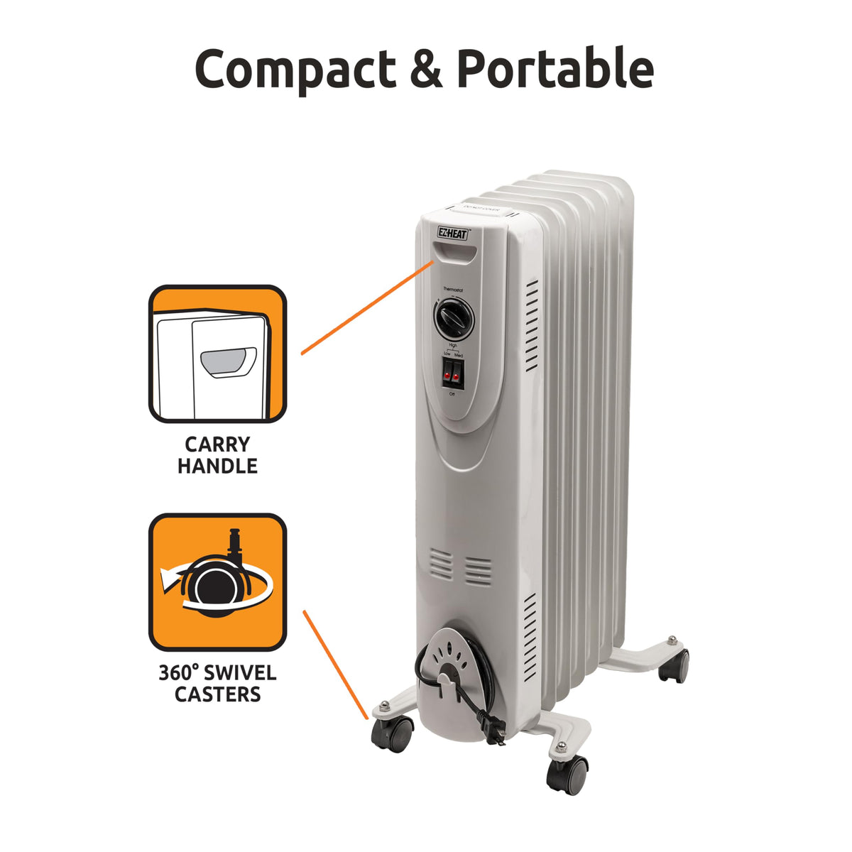 EZ-HEAT Oil-Filled Radiant Space Heater, 1500W, Adjustable Thermostat, Tip-Over Switch, White, Model MTDR-06WC
