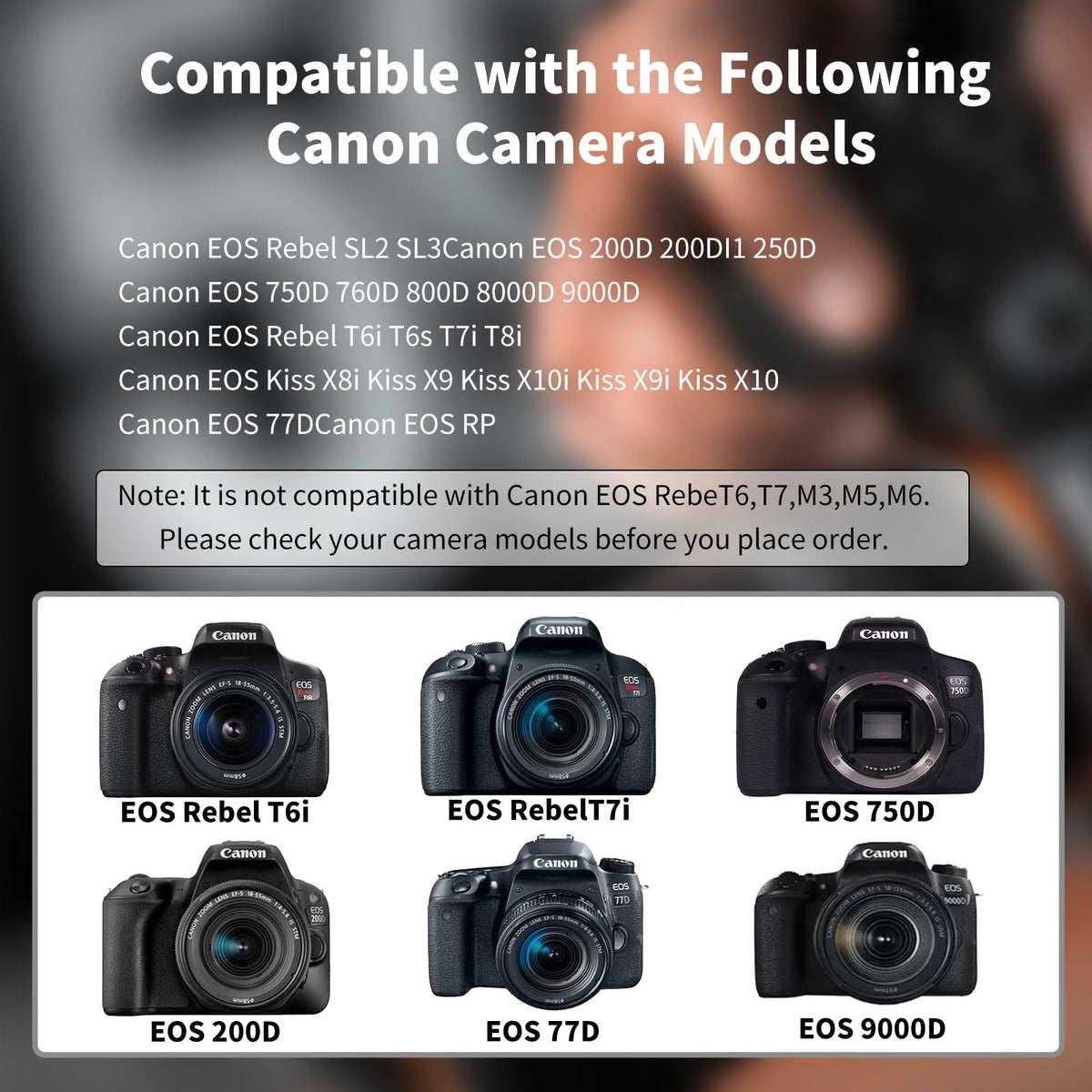 Compatible With The Following Canon Camera Models: Canon Eos Rebel T6I T6S T7I T8I Canon Eos Rebel Sl2 Sl3 Canon Eos Rebel Rp R10 Canon Eos Rebel 77D / 200D / 200D Mark Ii Canon Eos Rebel 250D 750D Canon Eos Rebel 8000D 9000D Canon Eos Kiss X8I X9I X10I X9 X10