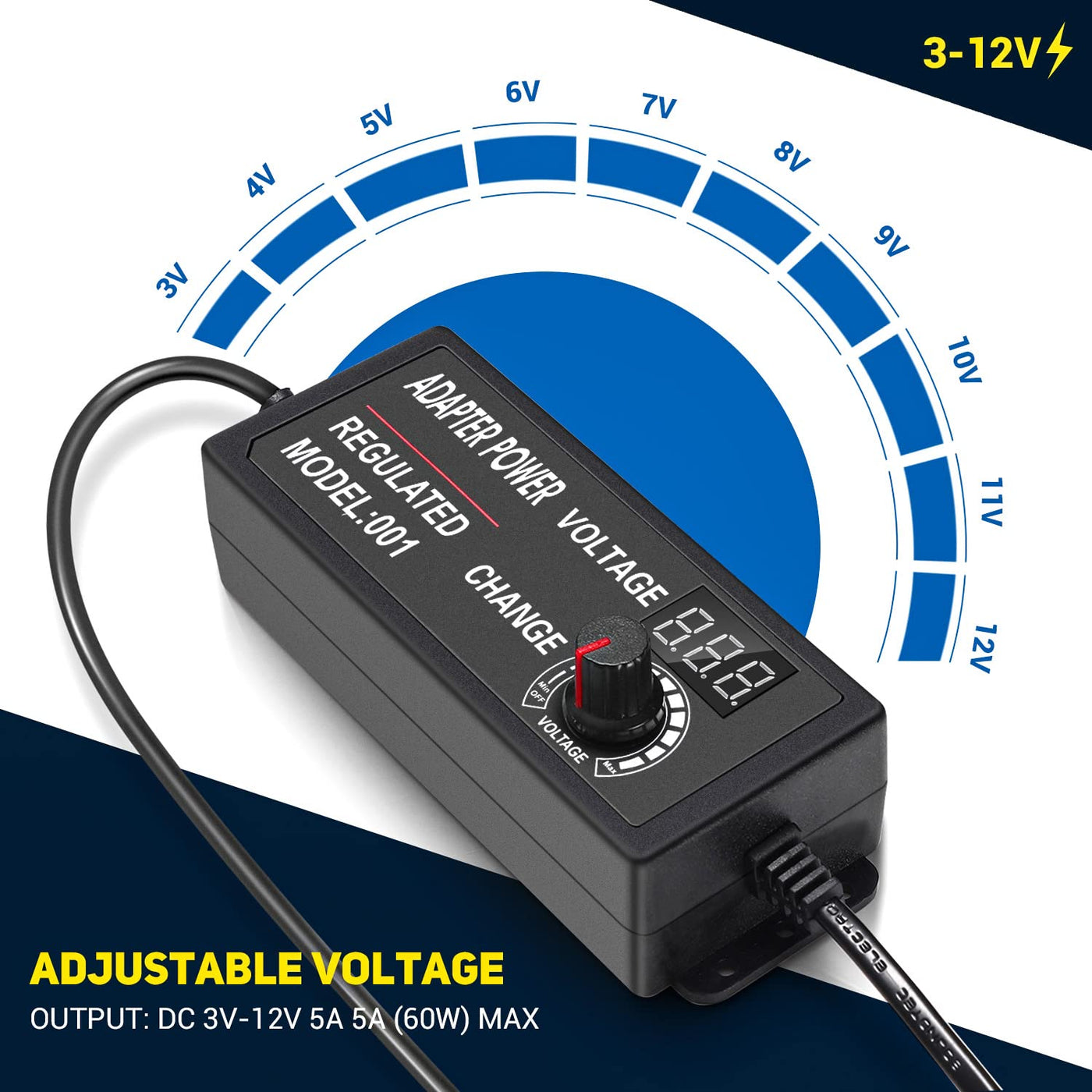 Facmogu 3V 12V 5A 60W Adjustable Power Supply With Led Display, Variable Dc 3V 5V 6V 9V 12V Universal Ac/Dc Adapter, 100V 240V A