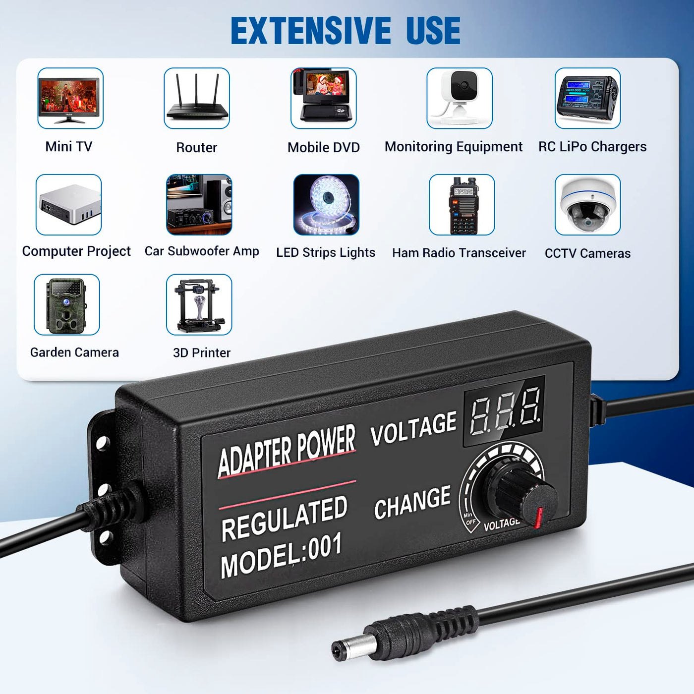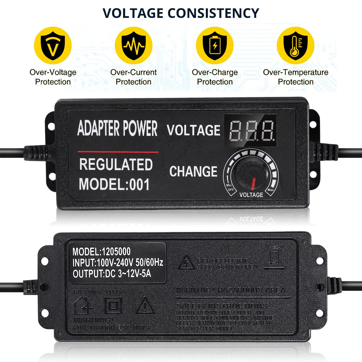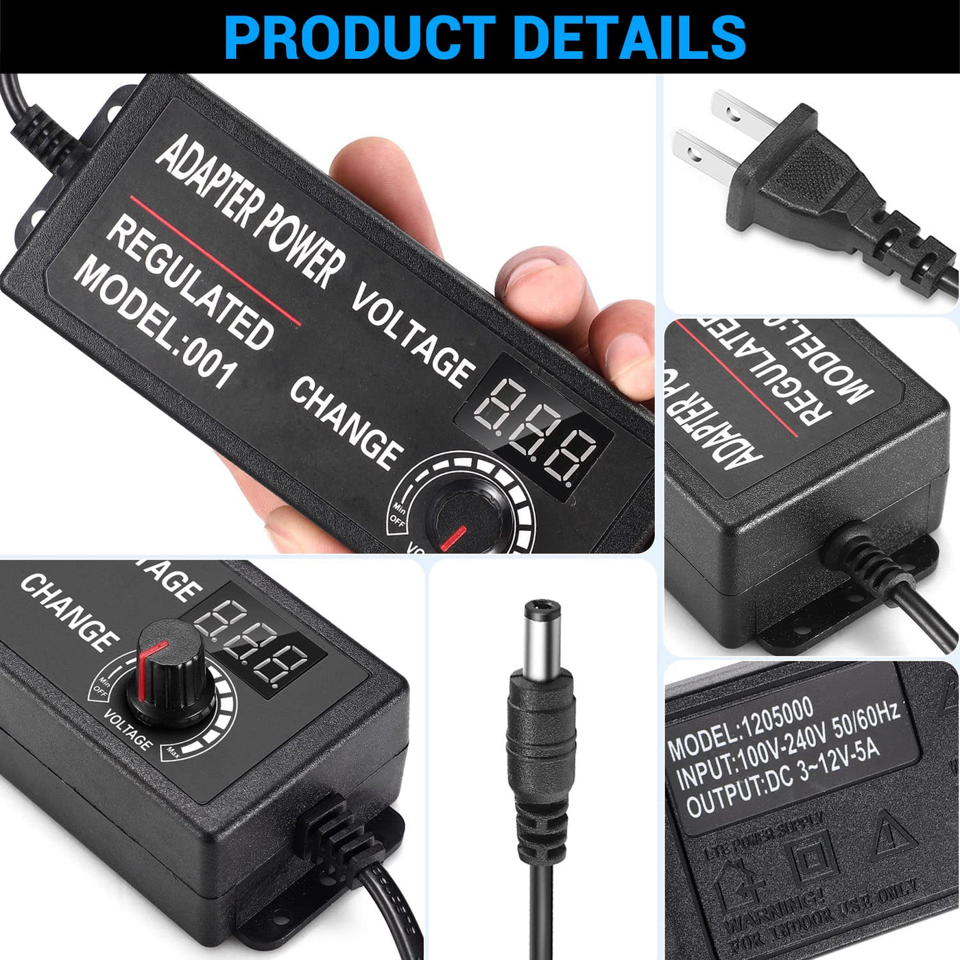 Input Voltage: Ac 100V240V 5060Hz Output Voltage: Dc 3V12V Adjustable Output Current Wattage: 5A, 60W Max Output Dc Plug: 55Mm X 25Mm Also Compatible With 55Mm X 21Mm (Inside +, Outside -) Total Length: 192Cm 63Ft Working Temperature: 0 - 40 Storage Temperature: -20 - 60 Package Included: 1Pcs X Acdc 3-12V 5A Adjustable Voltage Power Adapter (Us Plug)