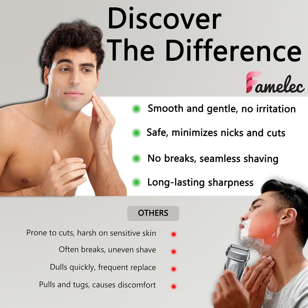 Q: What materials are used in the FAMELEC replacement head?A: The FAMELEC replacement head is crafted from high-quality materials that are both waterproof and rust-proof. This sturdy construction not only enhances durability but also provides a comfortable shaving experience.
