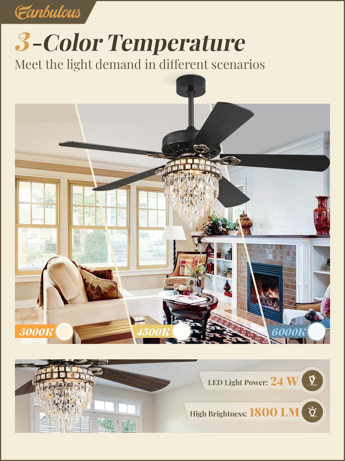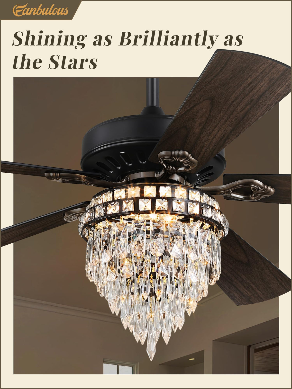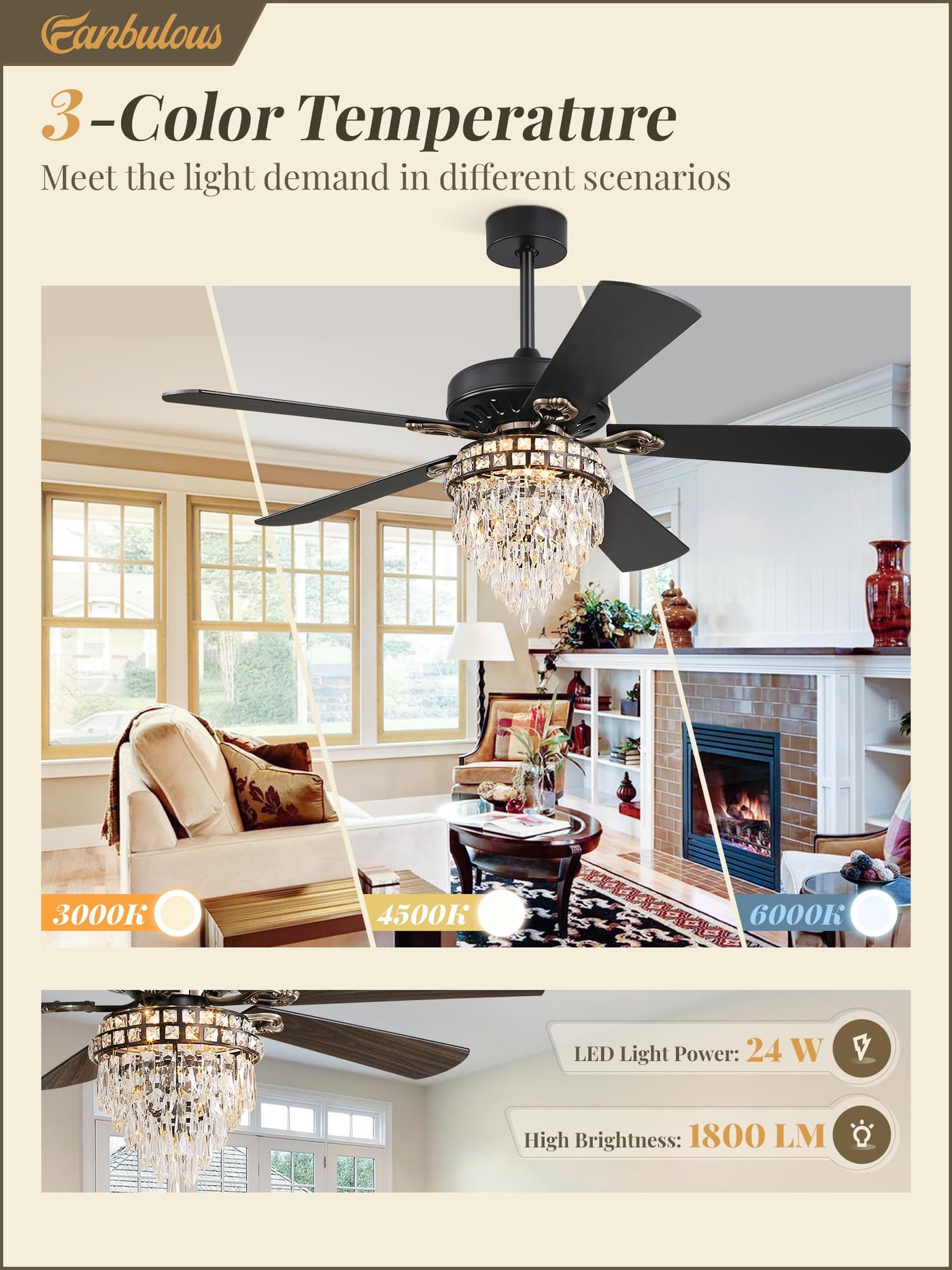 Fanbulous 60 Inch Farmhouse Crystal Fandelier Ceiling Fan With Light Has 6 Wind Speeds, 3 Color Temperatures Adjustable, Reversible Mode, 1/4/8-Hour Timer. Equiped With Powerful, Quiet Dc Motor, It'S Energy Saving. And It Perfect For Living Rooms, Bedroom, Dining Room