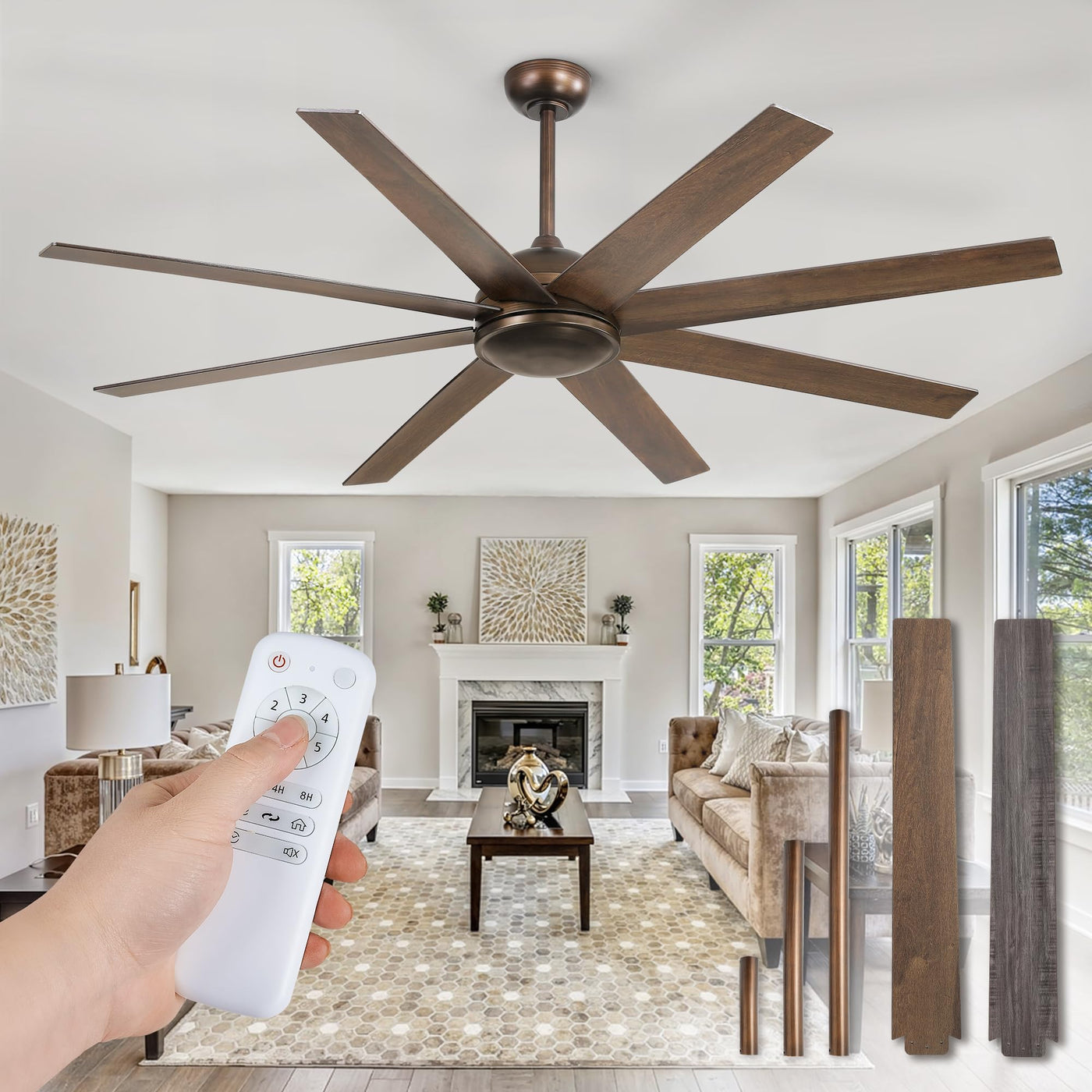 Q: How does the remote control work for this ceiling fan?A: The ceiling fan comes with a remote control that allows you to easily adjust the 6 wind speeds, switch between the reversible mode, and set the 1/4/8-hour timer. It can also be muted for silent operation, ensuring convenience without disturbance.