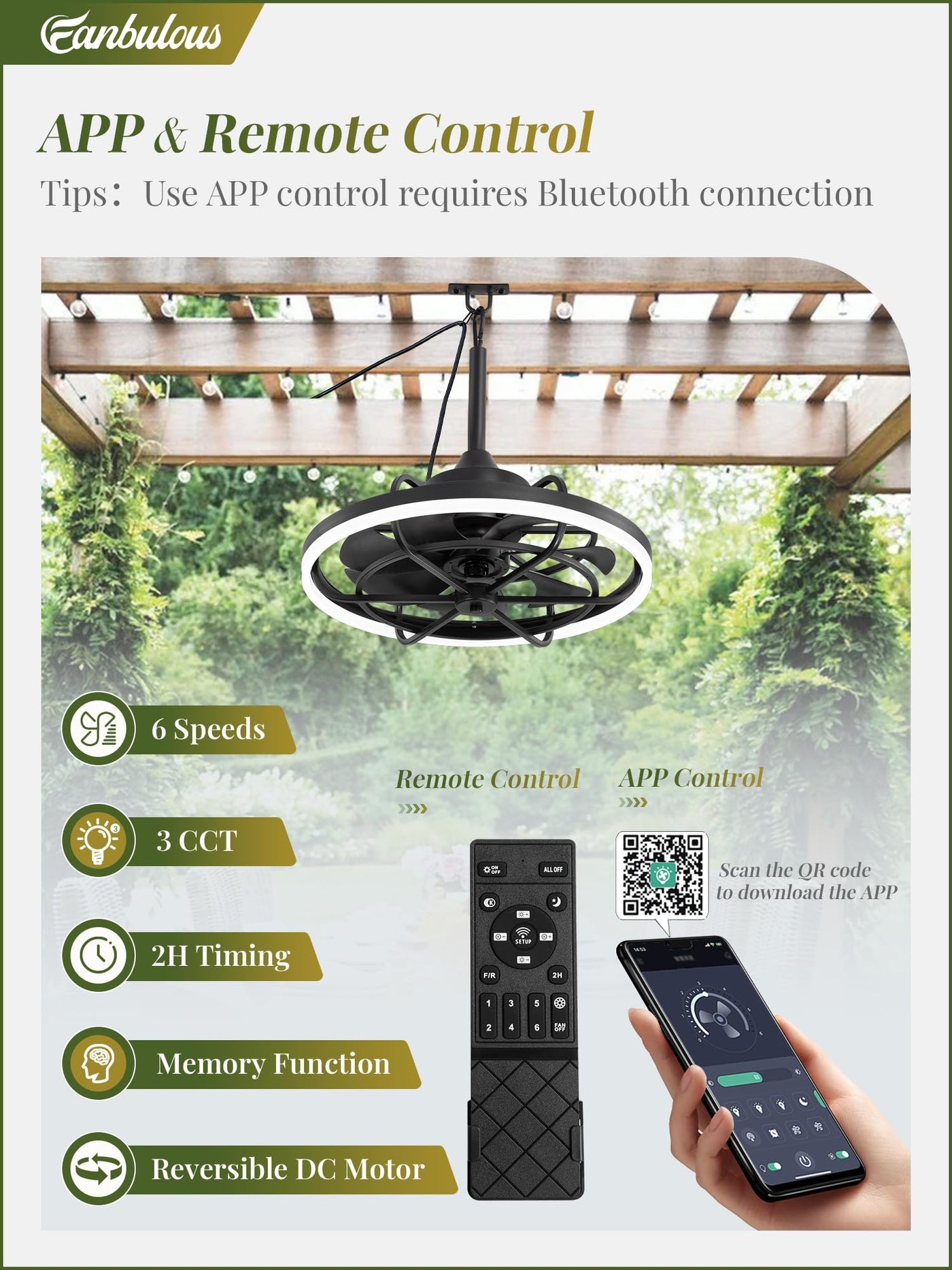 Fanbulous Outdoor Ceiling Fans With Light For Patios, 20'' Weatherproof Plug In Ceiling Fan, Gazebo Fan Remote&App Control, 3Cct Dimmable,Caged Ceiling Fan With Hanging Hook For Porch, Pergola,Canopy