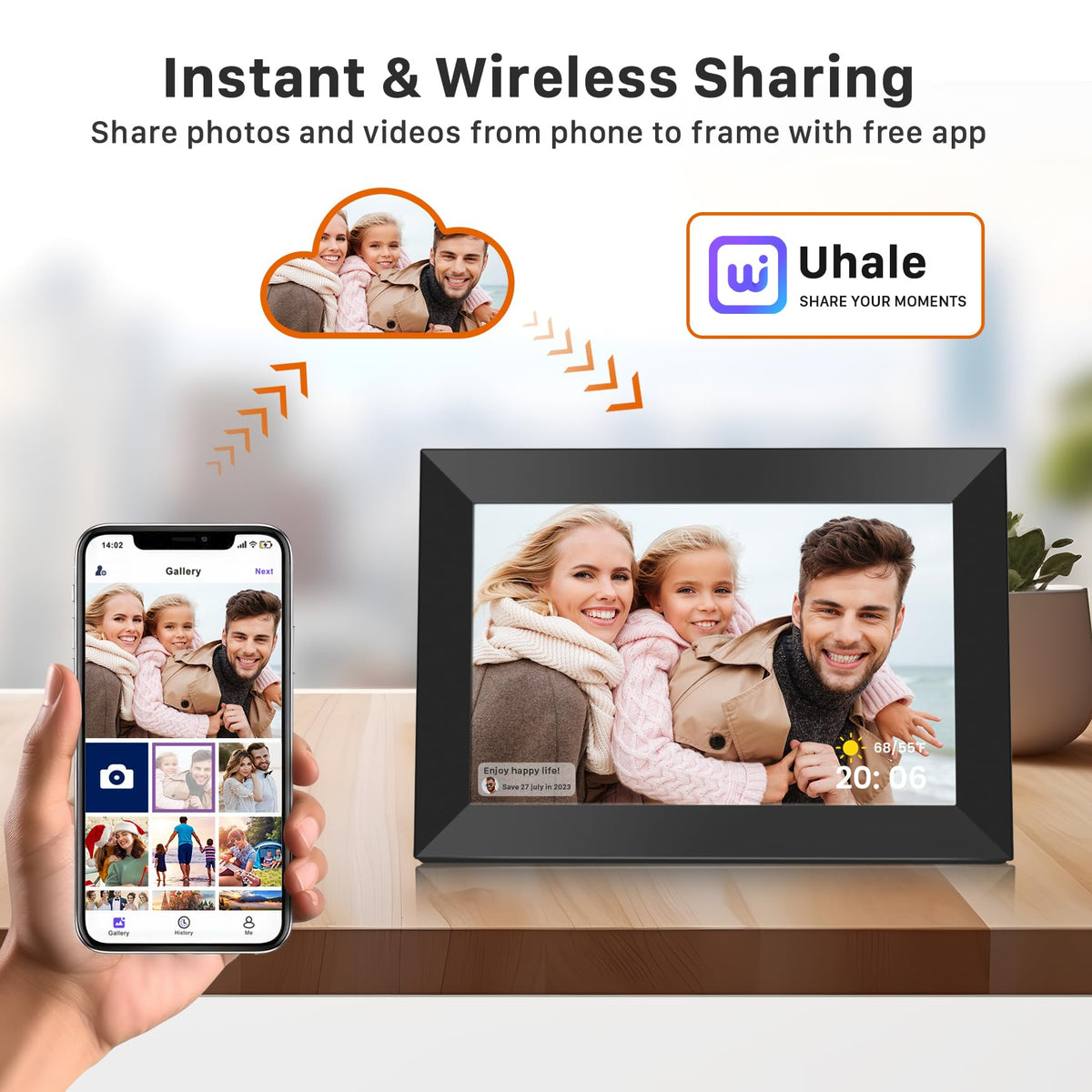 Q: How do I share photos and videos with the FANGOR digital picture frame?A: You can easily share photos and videos by using the free 'Uhale' app available for Android and iOS. Simply connect the frame to Wi-Fi, invite users, and start sharing your precious moments securely.