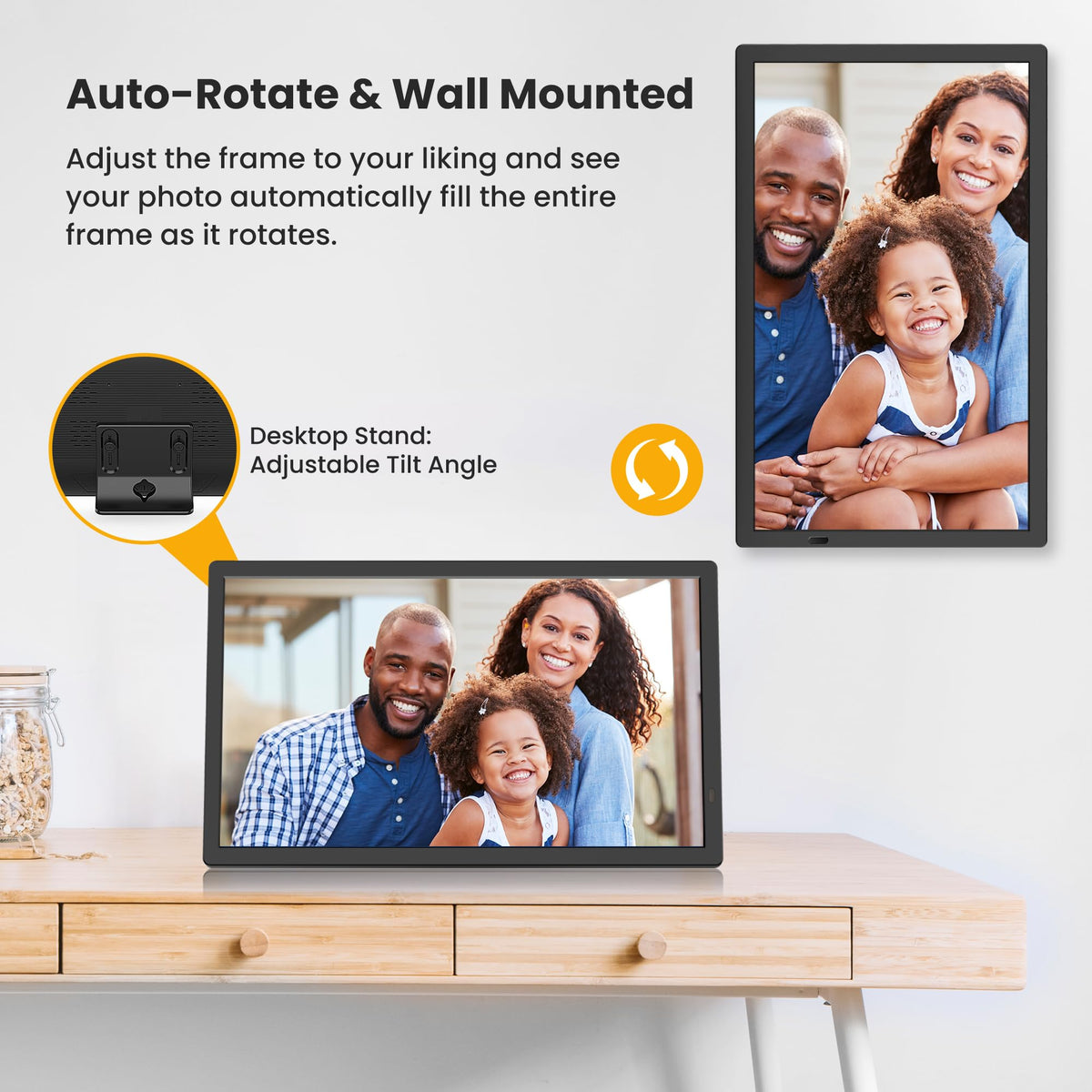 Q: Can the digital picture frame automatically rotate images?A: Yes, the FANGOR digital picture frame features an auto-rotate function that adjusts the orientation of your images to fit the frame perfectly without losing image quality.