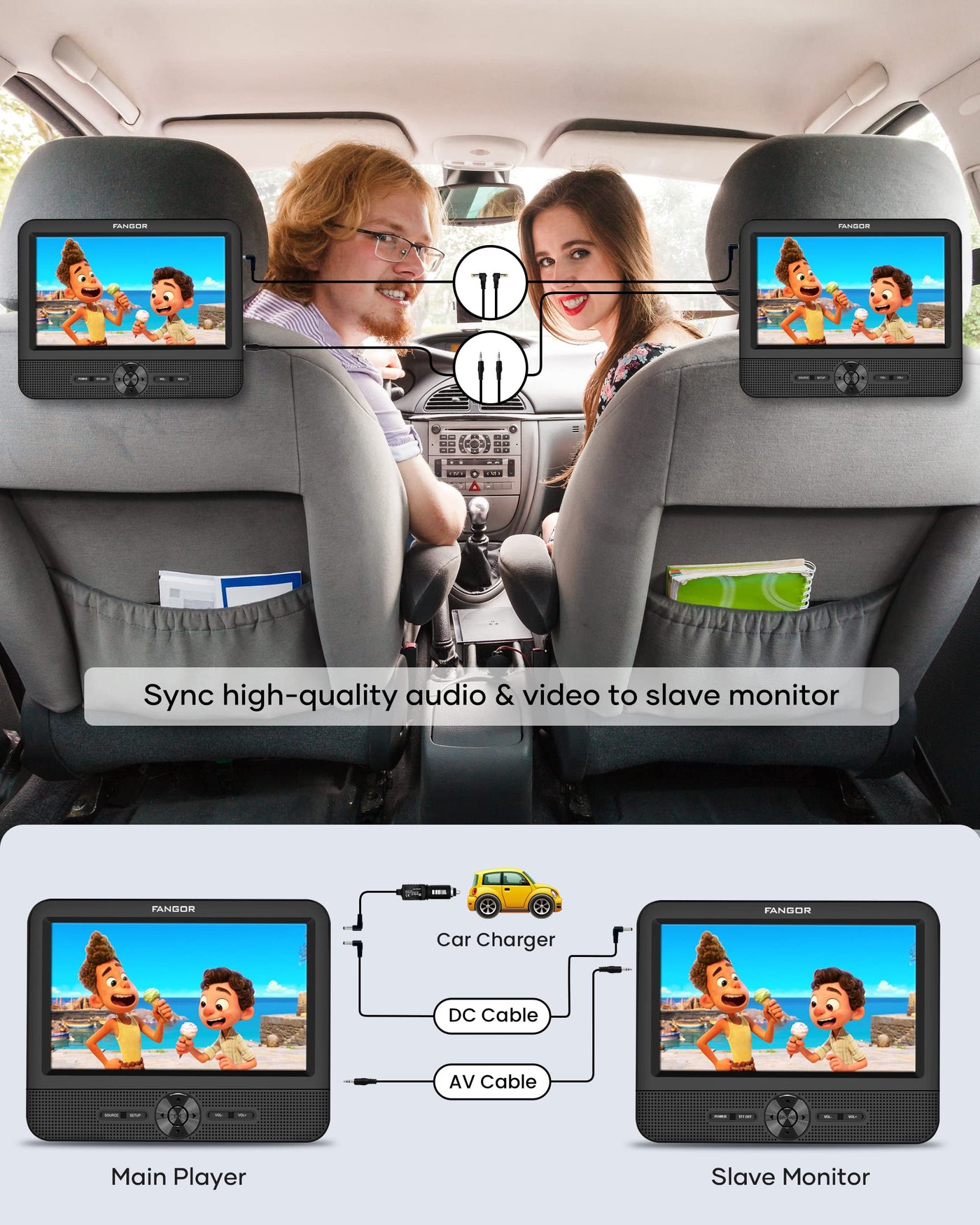 About Fangor: Fangor Focuses On High-Quality Portable Dvd Players And Has More Than 10 Years In This Field One Fantastic Gift Choice It Is Made Of One Dvd Player And One Slave Screen, They Will Play A Same Movie Via Simply Dc And Av Cable Connecting Regions Free And Last Memory Function, You Will Always Resume Play From Where You Left Off Last Time Ac Adapter (Available For 100-240V 50-60Hz Wall Outlet) Volume Control Can Be Adjusted To 20 By Touching The Player Itself Or Using The Remote 1024*800 Hd Screen Is Clear, Slave Monitor Will Accept Video And Audio Signal Via Av Cable And The Picture Is Almost Similar Ultiple Formats Compatibility, Usbsd Support And Av In Function Allow Sync Playback To Tv Screen Or Another Device Built-In Av Out Port Perfect For Long Road Trips Built-In Reliable High-Capacity 5 Hours Rechargeable Battery (A Full Charge) , Two Monitors Connecting Together Will Play About 25-3 Hours, It Is Great To Make Your Journey Even More Comfortable Come With Ac Adapter And Car Charger, You Will Be No More Worry About Interrupting By Low Battery Consumption Multiple Formats Support Disc Formats: Cd, Dvd, Dvd + R(-R), Dvd + Rw(-Rw), Vcd, Svcd-R(Rw), Cd -R(Rw), Not Blu-Ray And Mp4 Discs Usb, Sd And Mmc Card Support Up To 32G,And See Below Available Files Formats And Pixels For Video: Vob, Avi, Mpeg 1, Mpeg 2, Xvid (Maximum Resolution 720*576) For Music: Mp3Wma For Picture: Jpgjpeg Package: 1X 75 Dvd Player 1X 75 Lcd Screen 1X Ac Adapter 1X Car Charger 1X2M Av Cable 1X2M Dc Cable 1X Rca Cable 1X Remote Control 2X Mounting Straps 1X Use Manual