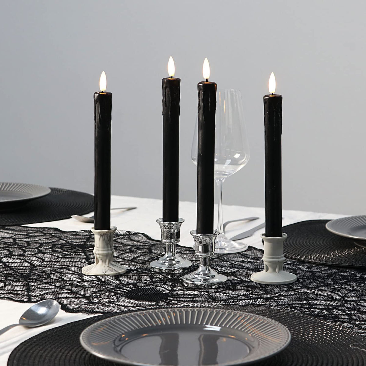 Flameless Dinner Candle&Nbsp;Comprises 6 Flameless Taper Candles With Warm White Led Lights And 2 Remotes With 8 Buttons.&Nbsp; The Candles Are Made Of Black Wax Dripping Material That Looks Like Traditional Candles But Provide A Safer Alternative Without The Risks Of An Open Flame.&Nbsp; The Candles Can Be Powered By 2 Aaa Batteries Each (Not Included) And Are Suitable For Decorating Houses And Parties Like Halloween.&Nbsp; The Entire Set Dimensions Are: Candles Size D0.79'' X H9.85''