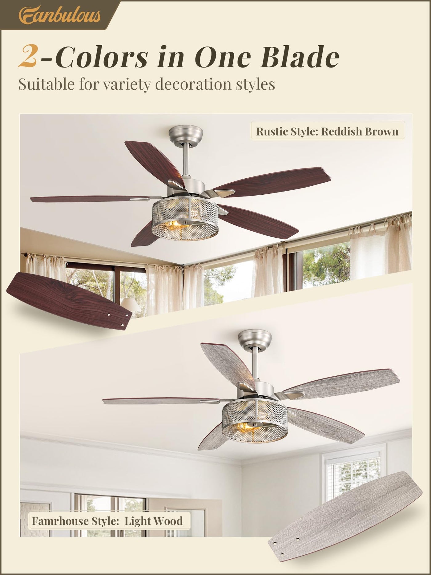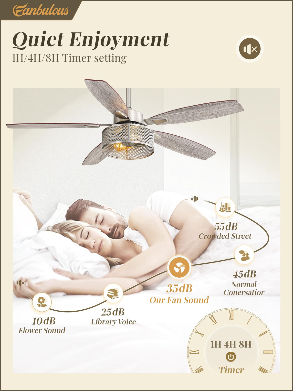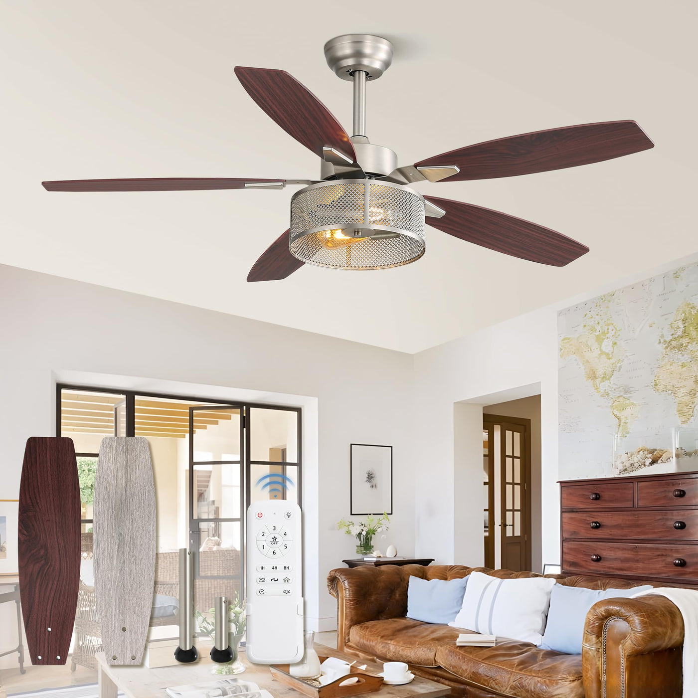 Farmhouse Brushed Nickel Ceiling Fans With Lights And Remote, 52 Inch Bedroom Caged Ceiling Fans For Living Room Kitchen,6 Speed