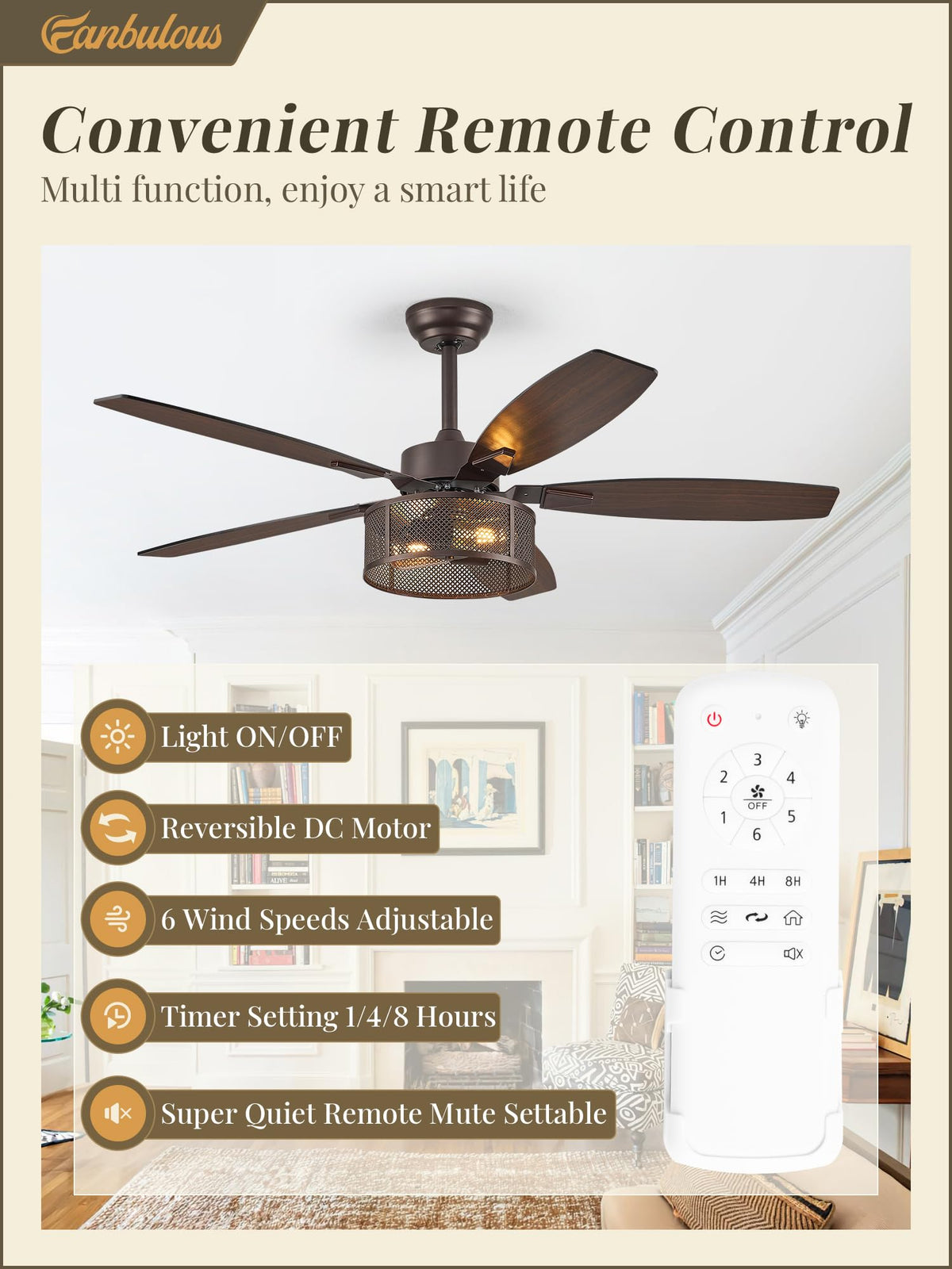 Q: How does the remote control work for the ceiling fan?A: The remote control allows you to effortlessly manage the ceiling fan's light on/off feature, select from 6 different fan speeds, and control the reversible function for seasonal comfort. It also includes timer settings for 1, 2, or 4 hours.