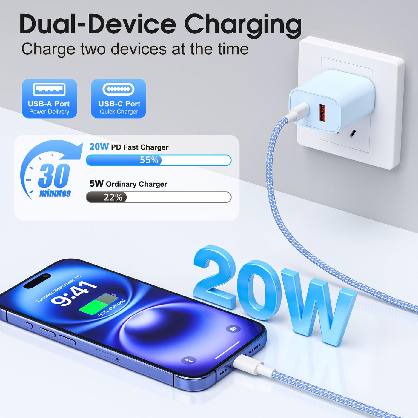 Fast Charger For Iphone 16 15, 4 Pack 20W Dual Port A/C Wall Charger Block For Iphone With 6Ft Usb C Fast Charging Cable Compati