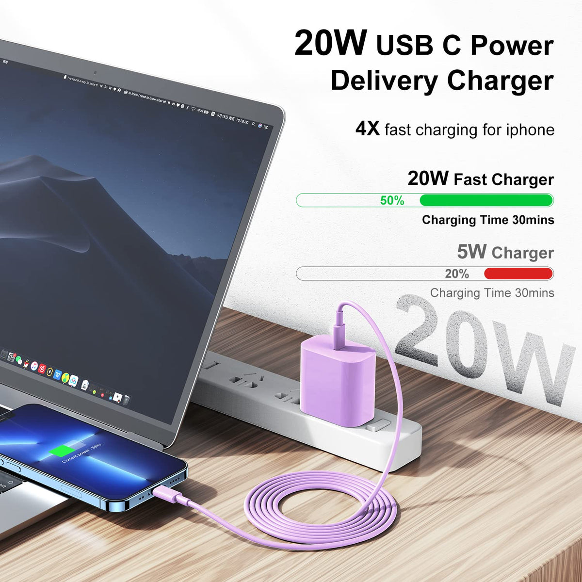 Q: How fast does the 20W USB C Charger charge my iPhone?A: The 20W USB C Charger can charge your iPhone from 0% to 70% in just 30 minutes, significantly faster than the standard 5W charger.