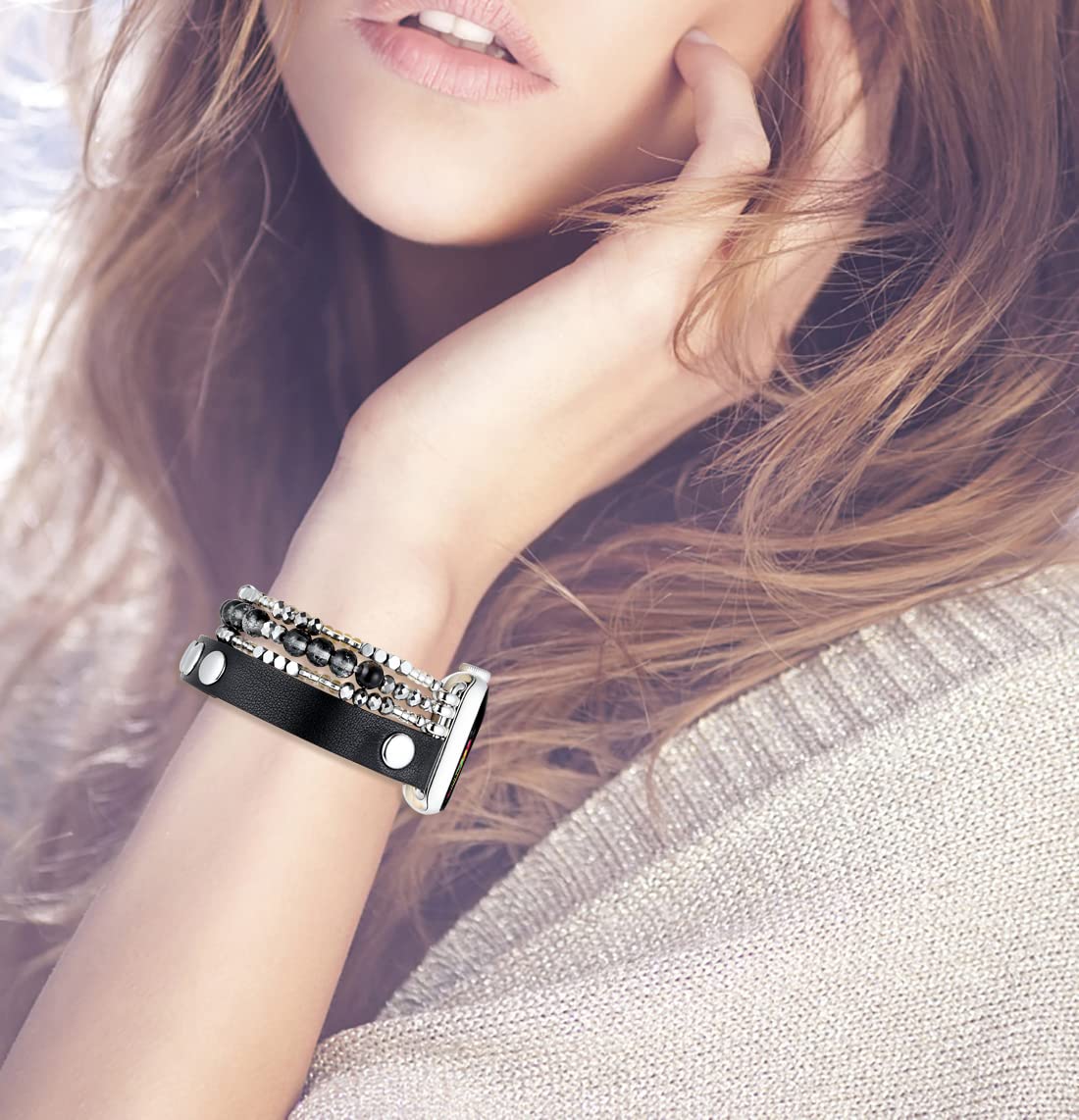 Or All Apple Watch Series:This Leather Bracelet Band Women In Black Color Is For Apple Watch 38Mm 40Mm 41Mm And For Iwatch Series Se And Series Ultra 8 7 6 5 4 3 2 1, For Apple Watch Sport And Apple Watch Special Edition, For All Apple Watch Series Super Comfortable:This Black Leather Beaded Bracelet Band For Apple Watch Is 100% Genuine Top Grain Leather Calf With Black Leather & Silver Stud Embellished+ Natural Crystal Beadsstones + Stainless Steel Connectoradaptor With Great Craftsmanship Comfortable And Durable To Wear, Also Dressy, Charming And Fancy Stretchy & Adjustable:This Fancy Dressy Elastic Beads Leather Band With Durable String Are Stretchy And The Black Leather Calf Band Is With Three Snap Fasteners For Size Adjustment To Fit For Different Sizes Between 55Inch To 77Inches, For Most Of Women Best Christmas&New Year Gift:Unique Band And Nice Gift Box Package For Upcoming Christmas And New Year For For Women, Girls, Teen Girls, For Grandma, Mom, Wife, Bridesmaid, Best Friend, Colleague, For Her Also Great Gift Choice For Anniversary, Birthday, Wedding, Engagement, Graduation, Mothers Day, Thanksgiving Graduation, Concert, Holiday Stylish And Unique Design:Unique Leather Apple Watch Bandsbraceletsbangles Black Genuine Leather Beaded Style Cuff Wrap Around Your Wrist, Girly And Cute To Be More Dressed Up Great Choice For Any Formal And Casual Occasions