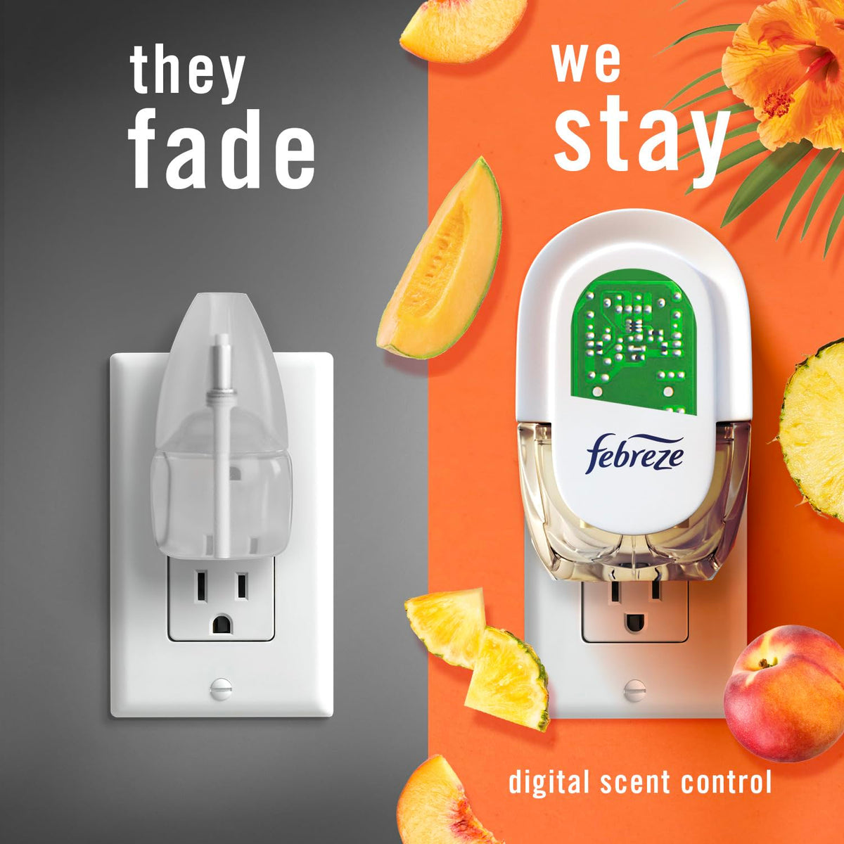 Have You Experienced Your Plug Air Freshener Scent Fading? Good News: Febreze Fade Defy Plug Air Freshener Stays True To Its Name, Delivering A First Day Fresh That Lasts A Full 50 Days (On Low Setting). Ready To Hit Refresh And Be An A+ Odor Fighter? Just Refill The Febreze Fade Defy Plug And Plug It Into Any Outlet (They'Ll Even Rotate If Your Outlet Is Upside Down) In Any High-Traffic Area Of Your Home... The Kitchen, Bathroom, Or Anywhere Else Odors Like To Linger. Bonus? When It'S Time For A Refill, The Automatic Air Freshener Will Let You Know With Its Handy Low-Level Indicator Light. And This Scent Refill Pack Comes With Three Fade Defy Plug Refills So You Can Keep That Freshness Going. With The Sweet Scents Of Pineapple, Melon, Peach, And Freesia, Hawaiian Aloha Whisks You Away To Your Very Own All-Inclusive Island. Looking For An Instant Burst Of Fresh On Funky Fabrics? Give Febreze Fabric Refresher A Try.