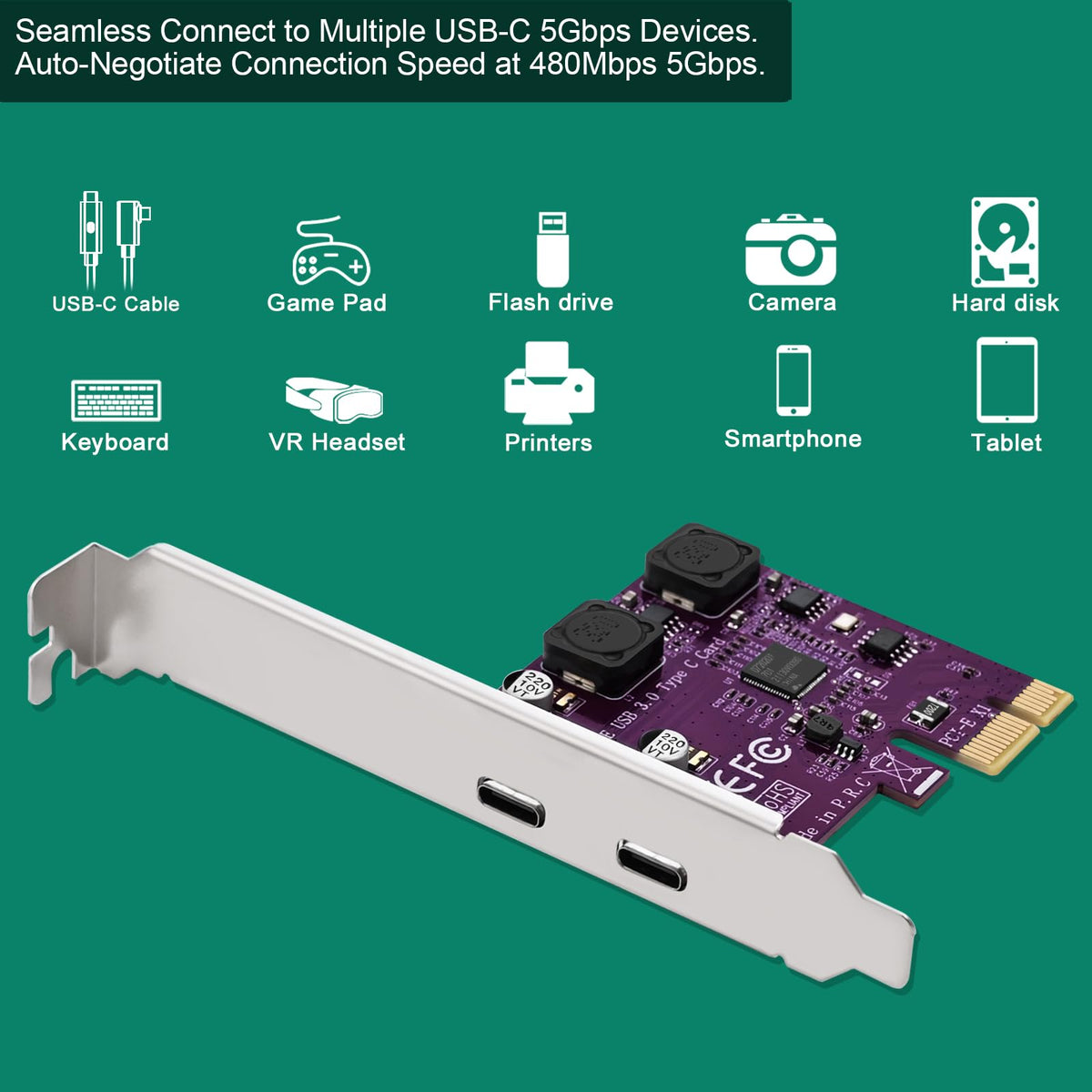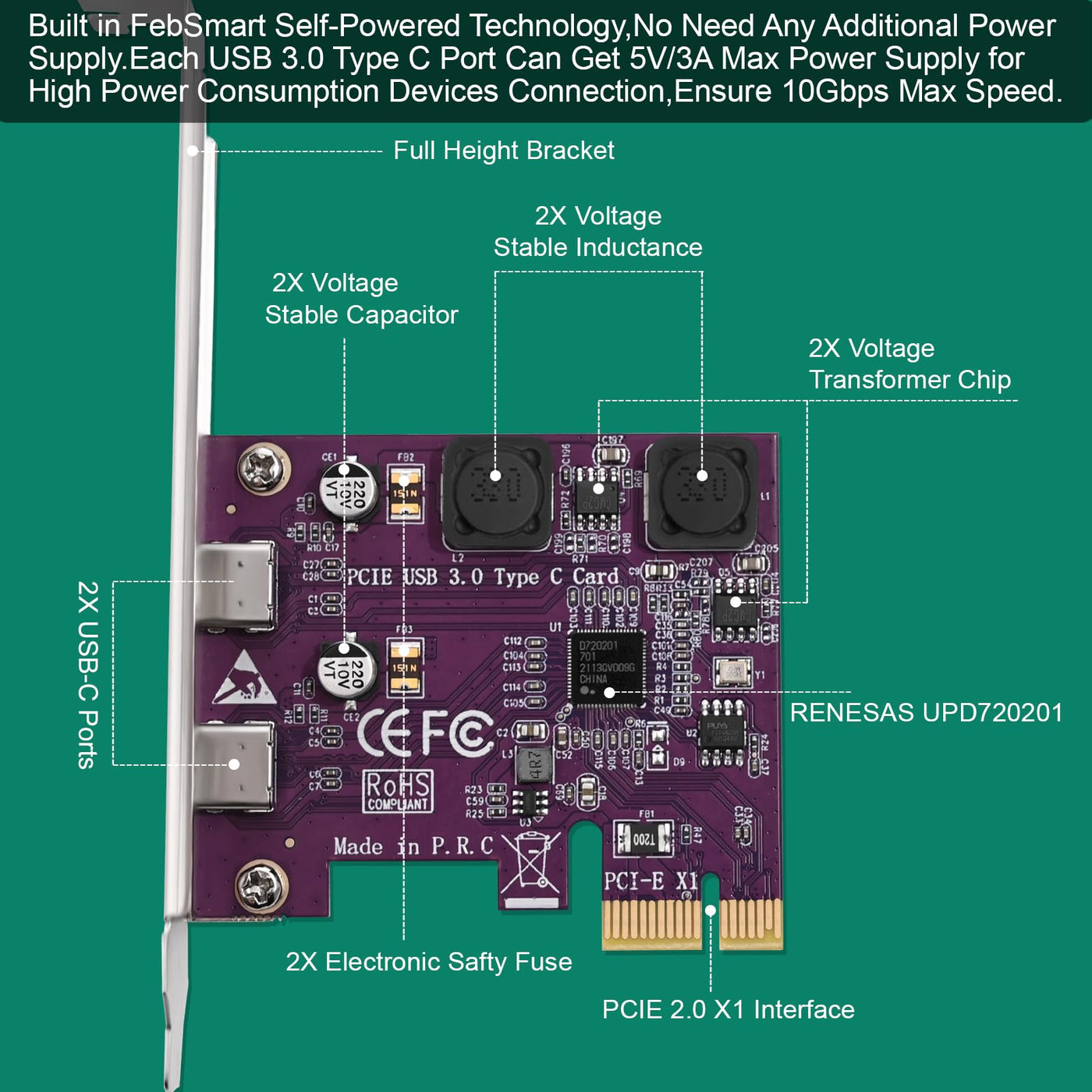 Febsmart 2X 5Gbps Usb C Ports Pci Express To Usb 3.0 Expansion Card For Windows 11, 10, 8.X, 7, Vista, Xp Desktop Pcs, Built In Self Powered Technology, No Need Additional Power Supply (Fs U302C Pro)