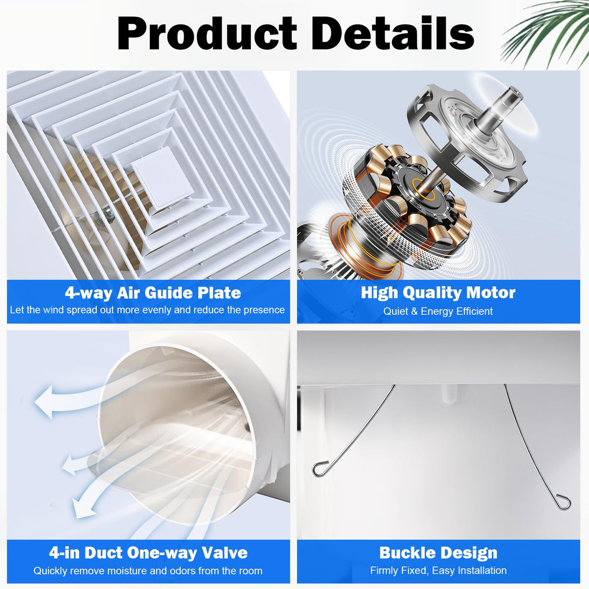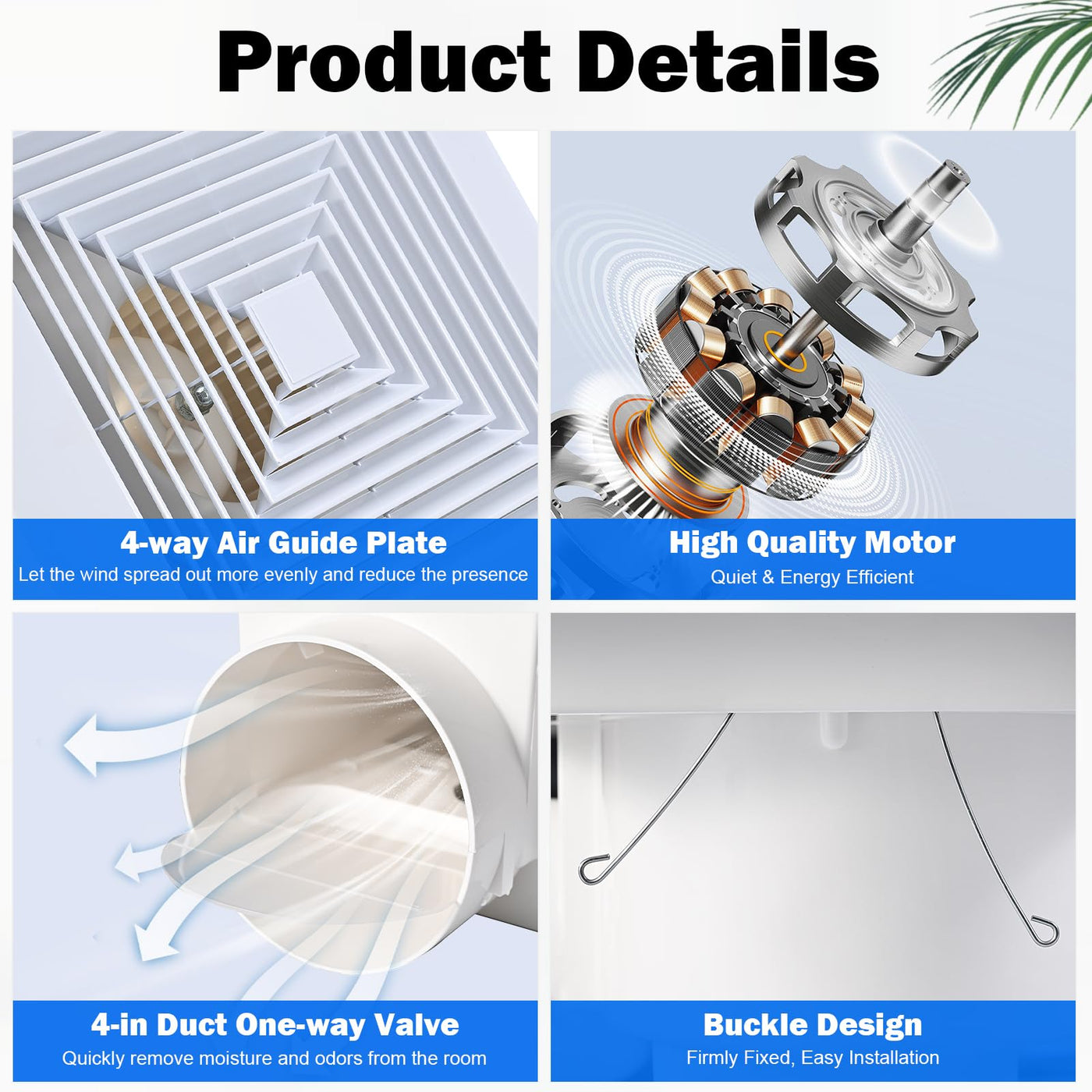 Feiton 110 Cfm Bathroom Fan Exhaust Fan Ceiling Mount, 26W, 110V, 1.0 Sones, Square Quiet Ventilation Fan, 4 In Duct, 9.1 X 9.1