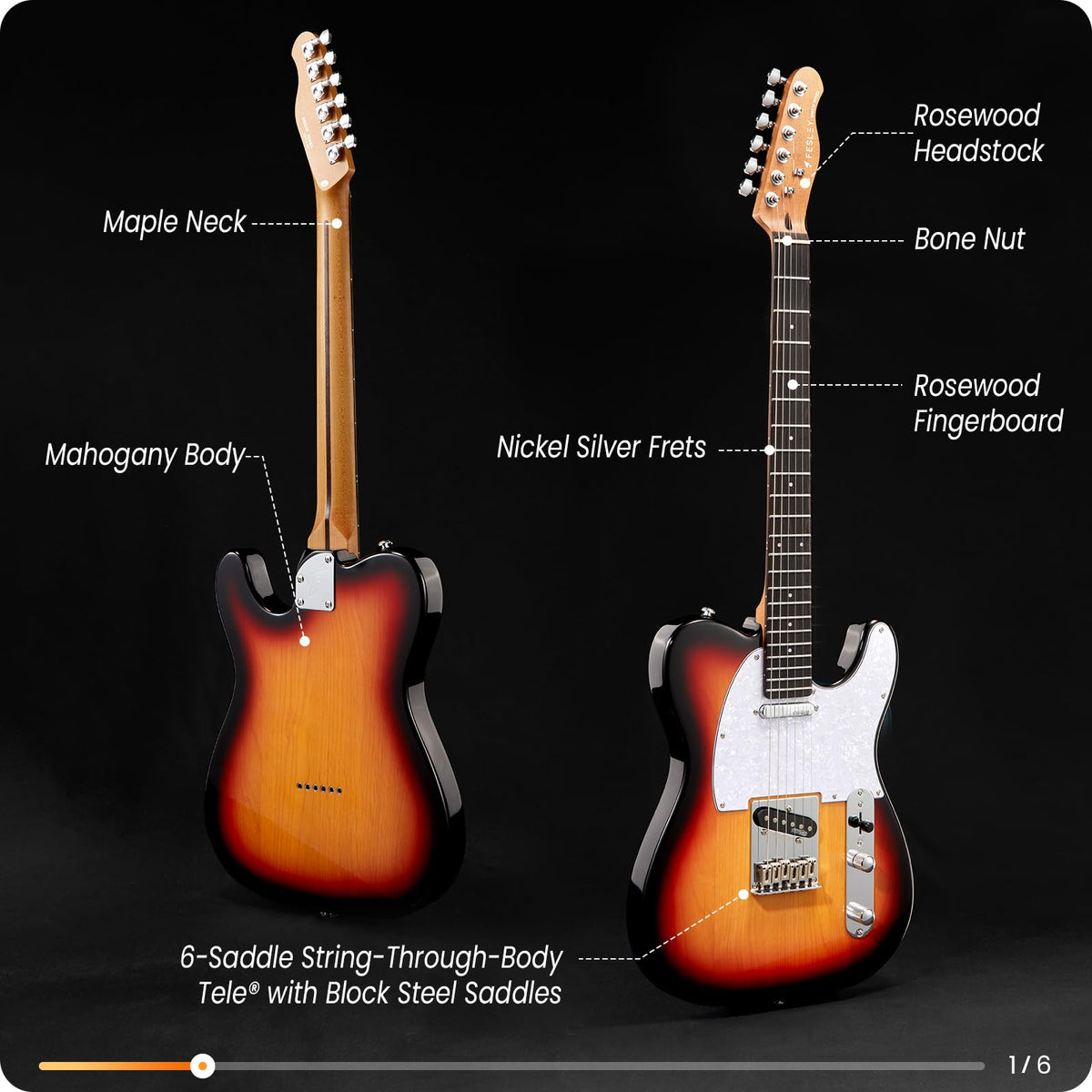 Unleash Legendary Tone And Unmatched Playability With This Fesley Electric Guitar. The 6-Saddle String-Through-Body Bridge Provides Exceptional Sustain And Resonance, Ensuring Each Note Rings With Clarity And Power. Grover Tuners Deliver Rock-Solid Tuning Stability, While The Deeply Sculpted Neck Joint Offers Effortless Access To All 22 Frets For Seamless Playing. Equipped With Single-Coil Pickups, It Delivers Bright, Articulate Tones And Versatile Sound, From Sharp, Cutting Highs To Smooth, Warm Lows. The Modern C Neck Profile And Satin-Finished Roasted Maple Neck Ensure Comfort For Extended Sessions. The Solid Mahogany Body Enhances Tonal Warmth, While The Carbonized Headstock Adds Durability And A Sleek Look.
