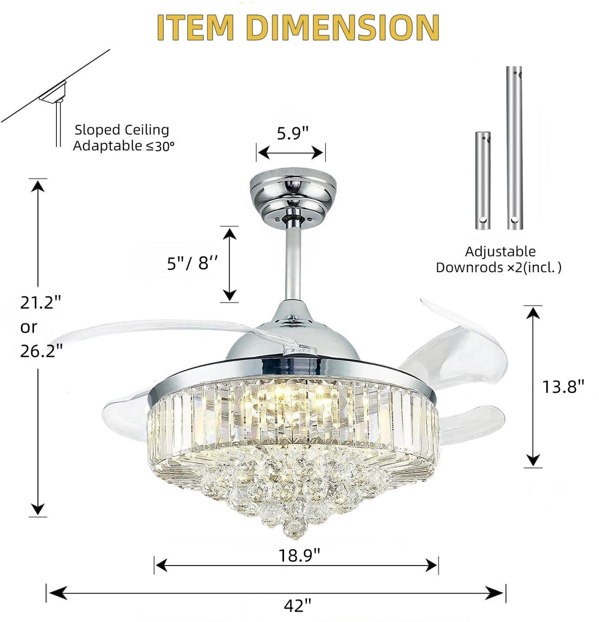 Fidgra 42'' Fandelier Ceiling Fan With Light, Retractable Chandelier Fan Led Dimmable Crystal Ceiling Fan For Bedroom Living Roo