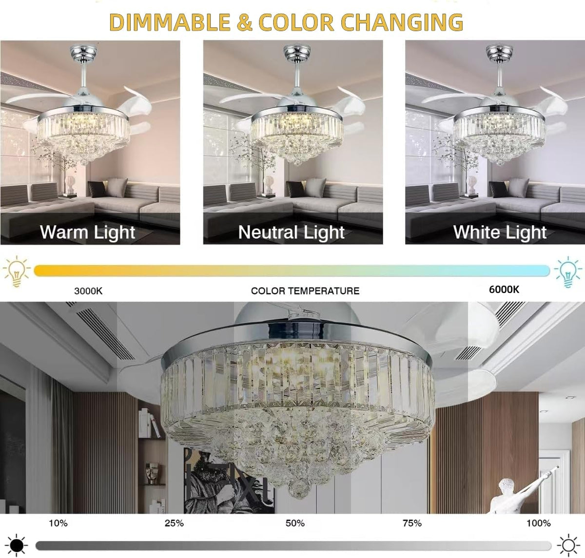 Q: How does the dimmable feature work on this chandelier fan?A: The FIDGRA Ceiling Fan allows you to adjust the brightness from 10% to 100% and change the color temperature from warm white (3000K) to natural white (4500K) and cool white (6000K), providing customizable lighting options for any occasion.