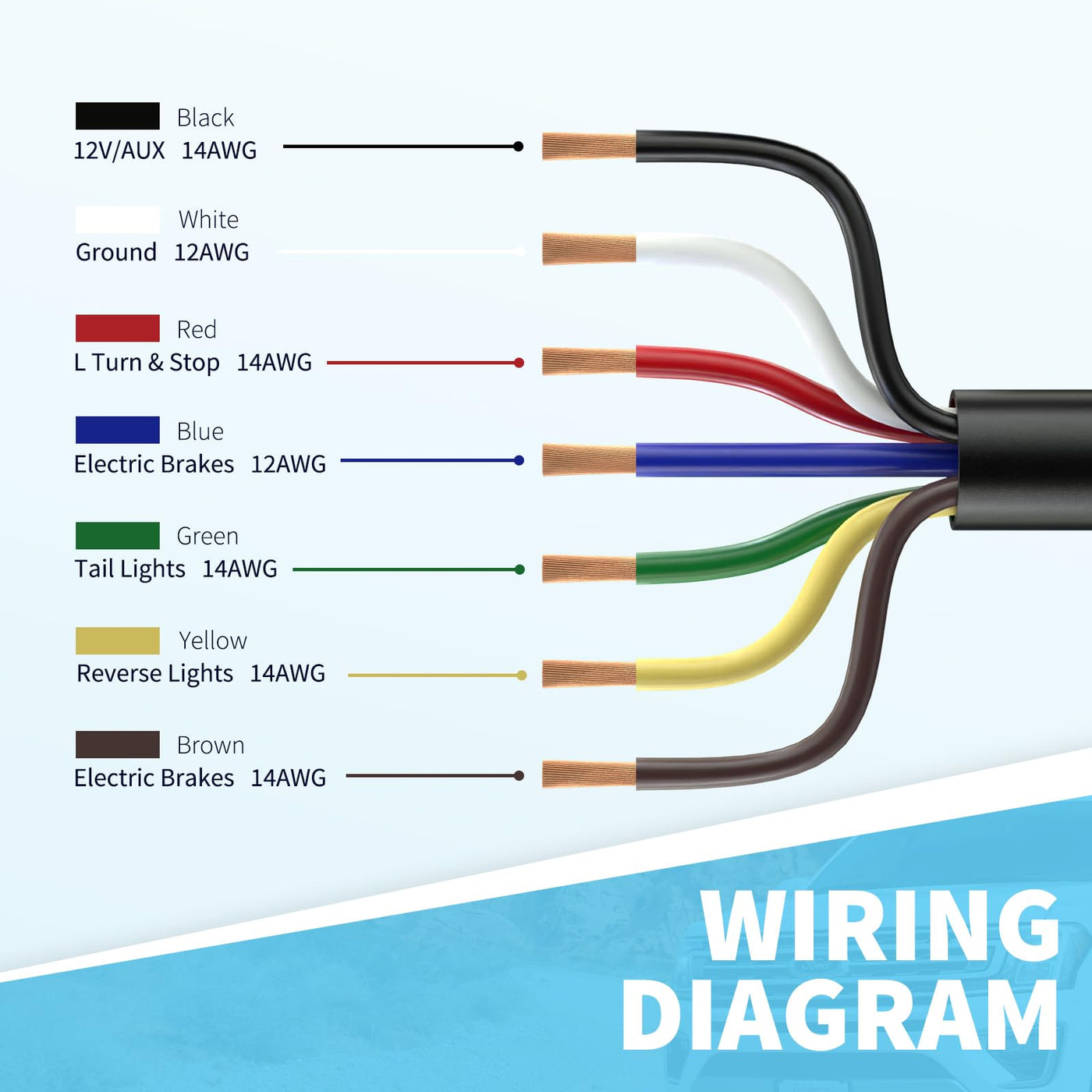 • Q: What are the specifications of FIRMERST 12/2 and 14/5 Pure Copper 7 Way Trailer Wire? A: The FIRMERST trailer wire is UL Listed and comes in a 10-foot roll. It features 12 AWG blue and white wires, and 14 AWG for the remaining wires, accommodating larger loads for braking and power needs. It operates within a temperature range of -20℃ to 80℃ and has a 300V rating.