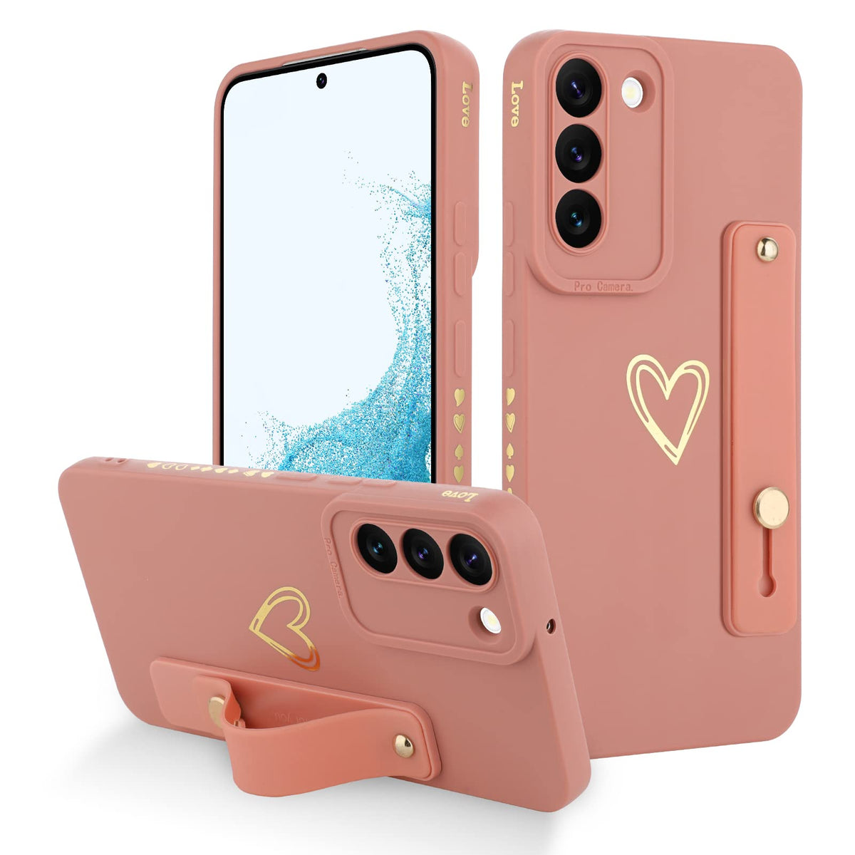 Fiyart Galaxy S22 5G Case Love Hearts Pattern, Slim Protective Cover With Stand, Wrist Strap, Camera Protection Pink