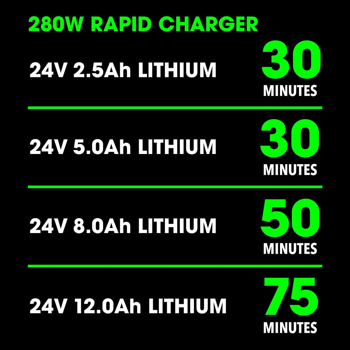 Q: How long does it take to charge a 24V 5.0Ah battery with this charger?A: The FLEX 24V charger can fully charge a 24V 5.0Ah Lithium battery in just 30 minutes, providing quick turnaround for your tools.