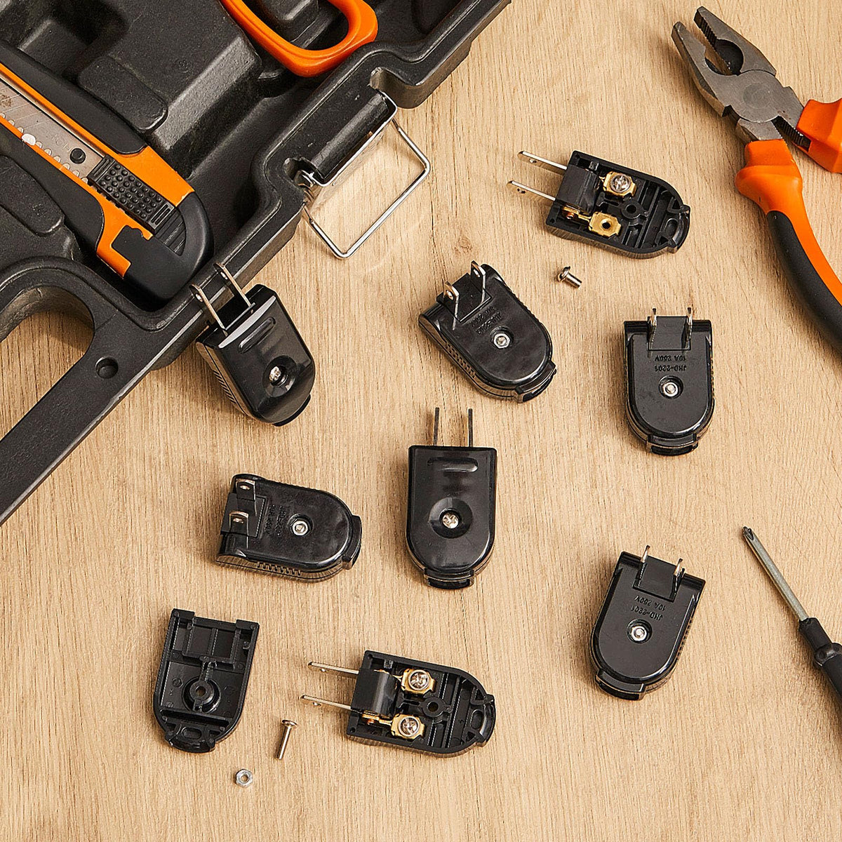 Q: How many replacement plugs are included in the package?A: The package includes 15 pieces of 2 prong extension cord replacement male electric plugs, providing ample supply for various uses.