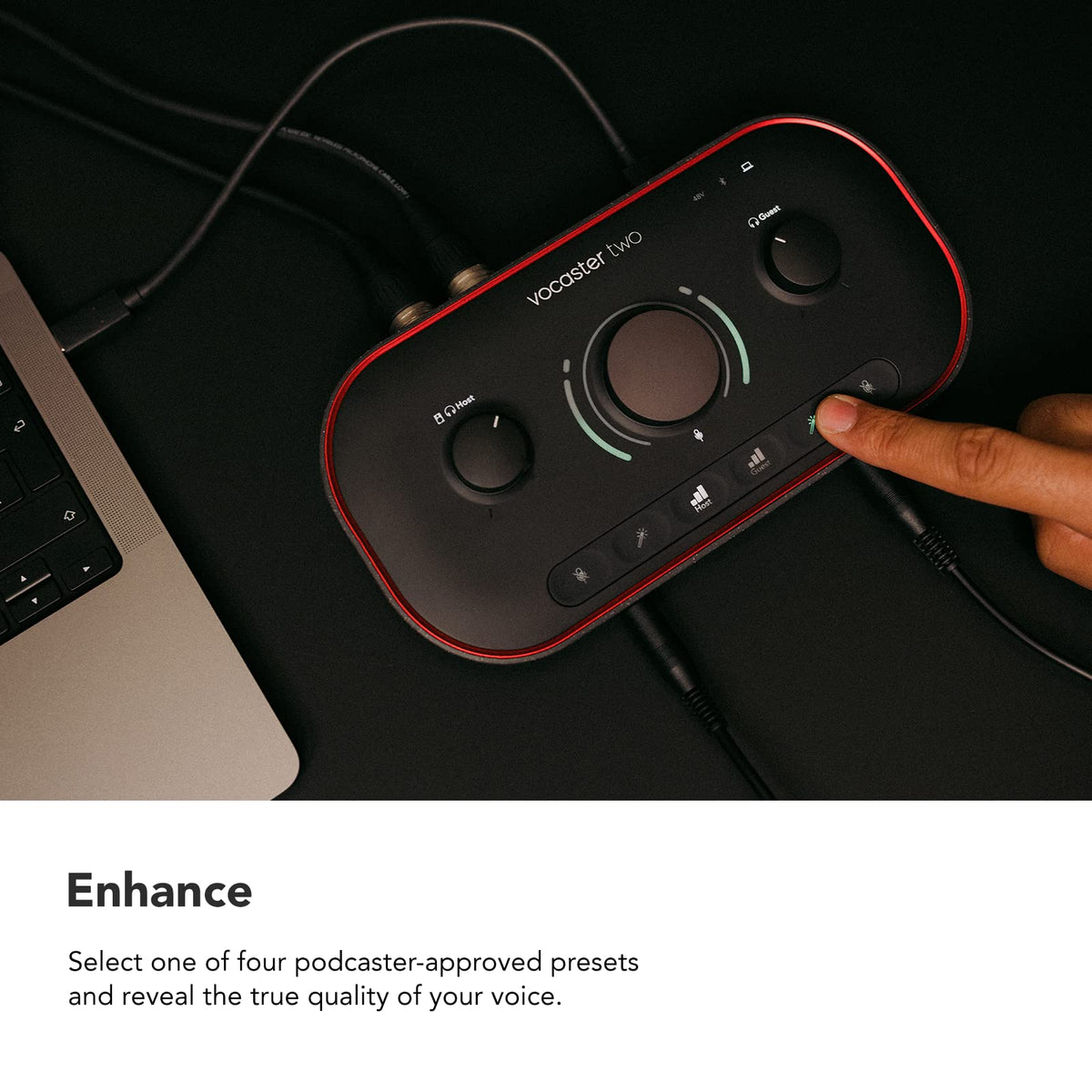Studio Sound In Secondsa- Auto Gain Sets Your Levels With The Click Of A Button, With More Than Enough Gain On Tap For The Most Popular Broadcast Mics - No Booster Needed Find Your Voicea- The Enhance Button Reveals The True Quality Of Your Voice Four Podcaster-Approved Presets Bring Out The Best In Any Voice In One Click, And You Can Customise Your Own With Vocaster Hub Join The Conversation - With Two Xlr Mic Inputs And Two High-Quality Headphone Outputs, Both Of You Can Record And Hear The Show In Fantastic Detail Stay On Topic, No Distractions Cut It Outa- Donat Let Coughs And Sneezes - Or Any Other Unexpected Interruptions - Mess Up Your Podcast Hit The Mute Button And Silence The Mic Until Youare Ready To Go Again Quality In, Quality Out - Our Premium Dynamic Mic Captures Your True Voice And Connects You With Your Audience Built In Windshield And Shock Mount Keep The Noise Down And The Energy Up Hp60V Closed-Back Studio Headphones Let You Hear Your Show As The World Will And Stop The Mic From Picking Up Your Show Mix Itas Your Call - Bring In Guests Over The Phone With Bluetooth Or A Single Cable And Capture The Whole Conversation Or Record High Quality Music Or Other Audio From Your Device, Seamlessly Sound As Good As Your Video Looksa- Youare One Trs Cable Away From Adding Vocasteras Studio Sound To Your Vlog No Need To Sync Up In Post, Just Plug In And Hit The Red Button Add A Professional Toucha- Stream Pre-Recorded Segments Such As Intros, Outros, Calls Or Any Other Audio You Can Think Of From Your Computer With Two Sets Of Stereo Loopback Keep The Story Going And Sound Just Like Youare In A Broadcast Studio Take It Awaya- Vocaster Two Is Small, Light And Powered By Your Computer So You Can Join The Conversation Wherever It Is Itas Never Been So Simplea- Our Easy Start Tool Is The Best In The Business And Gets You Up And Running Smoothly Vocaster Is So Easy To Set Up, Youall Be On-Air In No Time Three Years Of Warranty And Our Award-Winning 247365 Support Keep You There Everything You Needa- With Hindenburg Lite To Record, Three Months Of Squadcast Pro + Video To Bring In Your Guests, And Six Months Of Acast Influencer For Podcast Hosting And Monetization, Youare Ready To Get Your Show Out Thereaayou Can Also Try Hindenburg Pro For Six Months, Free Your Very Own Control Rooma- Get Your Show Sounding Great With Vocasteras Mixer Just Like A Broadcast Studio, Vocaster Hub Lets You Set Your Levels, Enhance Your Sound, Route Audio From Your Phone And Computer, And More Use Enhance Edit To Open Up Greater Control Of The Compression, Eq, And Rumble Reduction For Each Preset Hear Exactly What Your Listeners Will Hear With Show Mix - Even Without Your Computer Better For Everyonea- With Vocaster, Weave Taken Big Steps Forward In Reducing The Impact Our Interfaces Have On The Planet With Carefully Chosen Components, Biodegradable And Recyclable Packaging, And More Than Half The Plastics From Recycled Sources, Vocaster Is Better For Everyonea
