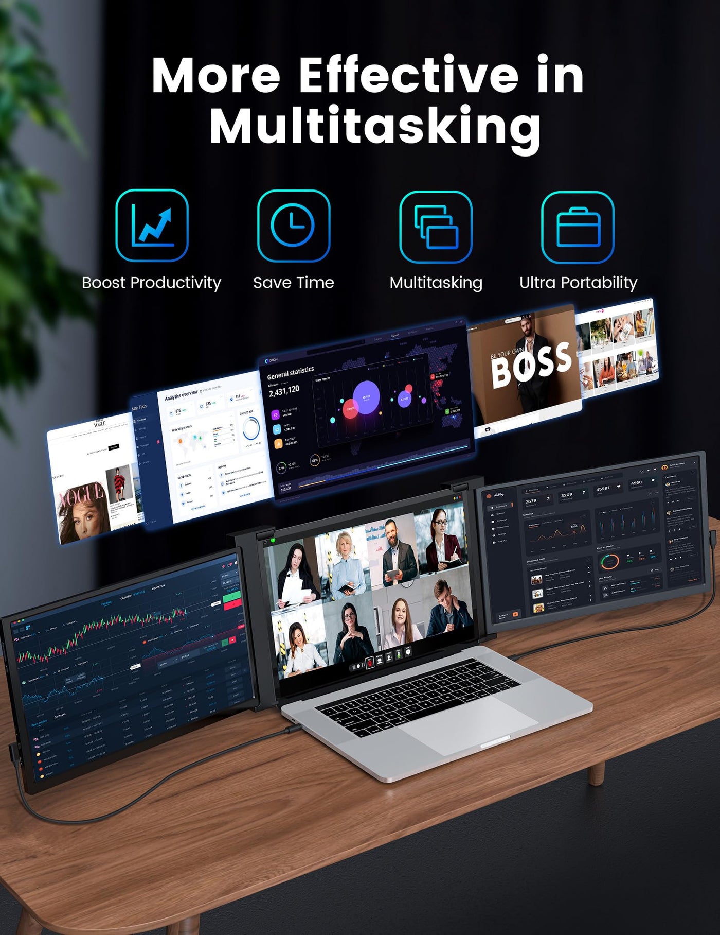Q: Is the FOPO Triple Monitor portable for travel?A: Absolutely! The FOPO Triple Monitor is designed for portability. It comes with a convenient carry bag and has a foldable, lightweight design, making it perfect for business trips, traveling, remote work, and presentations.