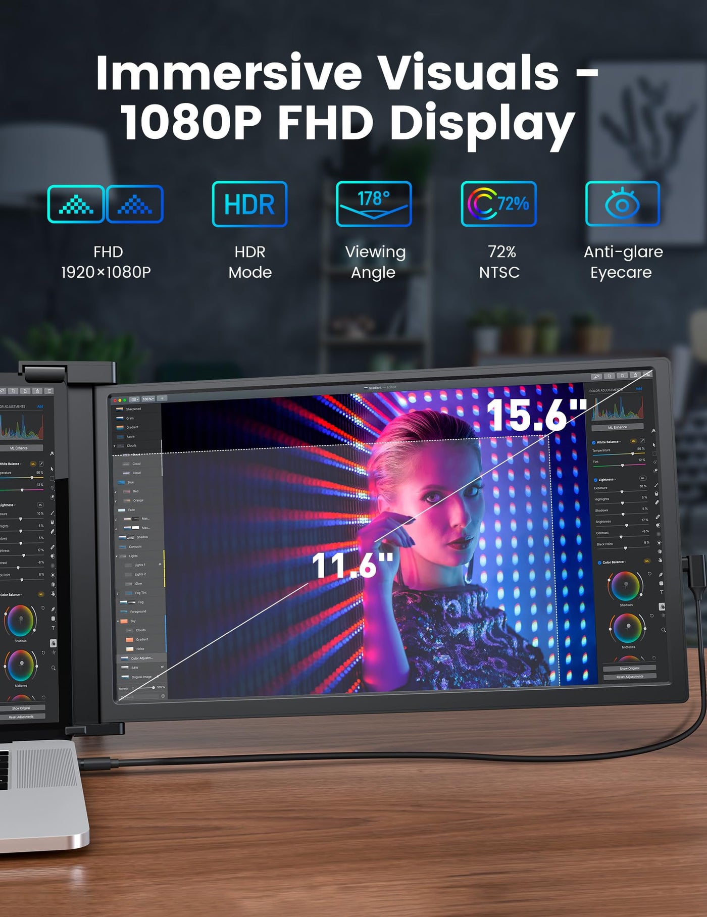 Stunning Visuals: Elevate Your Productivity With The15.6'' Large Laptop Monitor Extender. Experience Ultimate Multitasking And Vibrant Visuals With Multiple Screens. Attachable Portable Monitor For 15.6-17.3'' Laptops, It Expands Screen Real Estate For Optimized Efficiency. Enjoy Crisp Fhd 1080P And 72% Ntsc Display, Vivid Colors, And Wide Viewing Angles. Perfect For Professionals, Students, And Anyone Seeking Enhanced Productivity And Immersive Visuals. | Universal Compatibility: This Dual Monitor Offers Broad Compatibility, Allowing It To Work With A Range Of Devices Including Windows, Macos (Only For M1 Pro And M1 Max), Android, Switch, And Xbox, Among Others. Effortlessly Connect The External Monitor Screen To Your Preferred Device And Enjoy An Extended Display With Ease. Experience The Versatility And Flexibility Of Connecting To Various Platforms And Devices. (Note: Please Ensure Compatibility And Check Laptop Size Before Making A Purchase.) | Effortless Plug And Play: Enjoy Seamless Connectivity With Laptop Screen Extender For Triple Monitor Display. It'S A Plug And Play Device, Requiring No Complex Setup Or Installation. Simply Connect The Laptop Screen Extender To Your Laptop'S Usb-C Or Hdmi Ports, And You'Re Good To Go. The Package Includes All The Necessary Cables - 2* Usb-C To Usb-C, 2* Mini Hdmi To Hdmi, And 2* Usb-C To Usb-A, Along With A Power Adapter. Experience Instant Dual Screen Extender Productivity Without The Need For Extra Drivers Or Software. | Versatile And Portable: The Fopo Triple Monitor For Laptop Offers Dual Rotatable Screens, Giving You Flexible Viewing Options. The Right Screen Can Rotate From 0 To 180