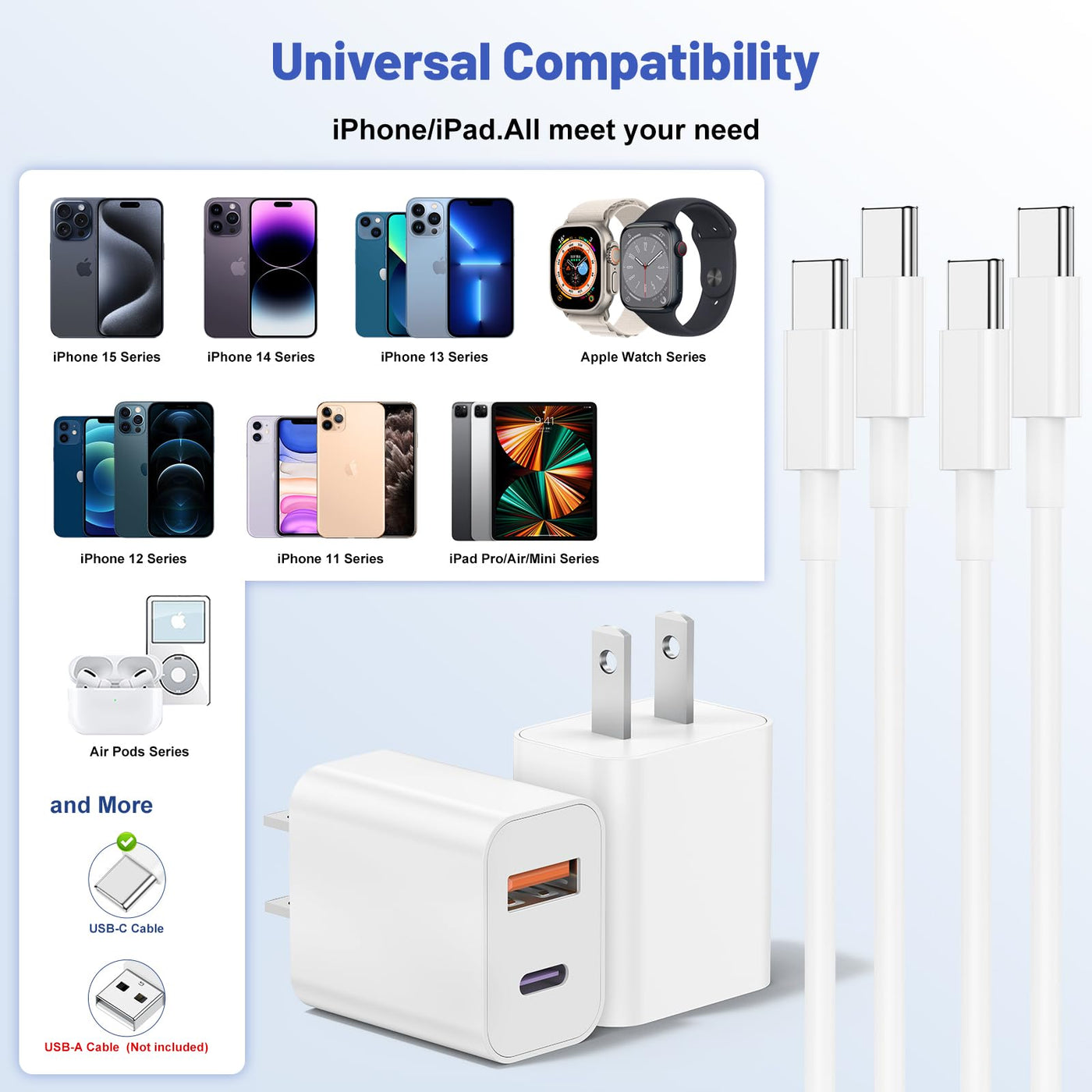 For Iphone 15 Fast Charger,[Apple Mfi Certified] 2Pack Dual Port 20W Pd Power Usb C Wall Charger Adapter With 10Ft Long Usb C Fa
